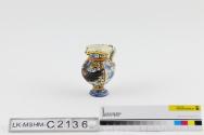 Irdenware (beiger Scherben), weiße Engobe , auf Glasur polychrom bemalt