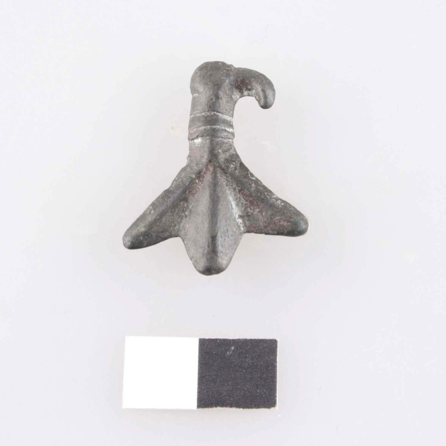 Zikadenfibel mit Adlerkopf, Schnabel durch feinen Steg vom Kopf abgesetzt, Würfelauge, Kopf durch quergerippten Hals vom dreigeteilten Schwanz abgesetzt; eiserne Spiralkonstruktion und Nadel fehlen.