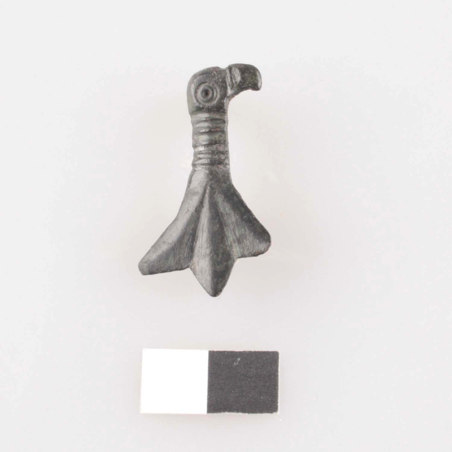 Zikadenfibel mit Adlerkopf, Schnabel durch feinen Steg vom Kopf abgesetzt, Würfelauge, Kopf durch quergerippten Hals vom dreigeteilten Schwanz abgesetzt; eiserne Spiralkonstruktion und Nadel fehlen.