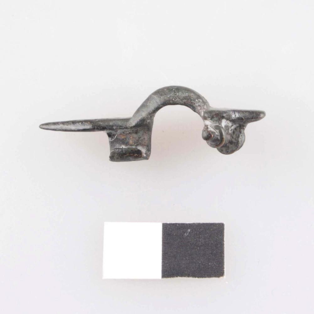 Bügelfibel aus Buntmetall mit im Querschnitt D-förmigem Bügel, dreilappiger Kopfplatte mit durchlochtem Spiralhalter und rhombischer, spitz auslaufender Fußplatte mit Nadelhalter, Spiralkonstruktion mit Spiralachse im Ansatz erhalten, Nadel fehlt.