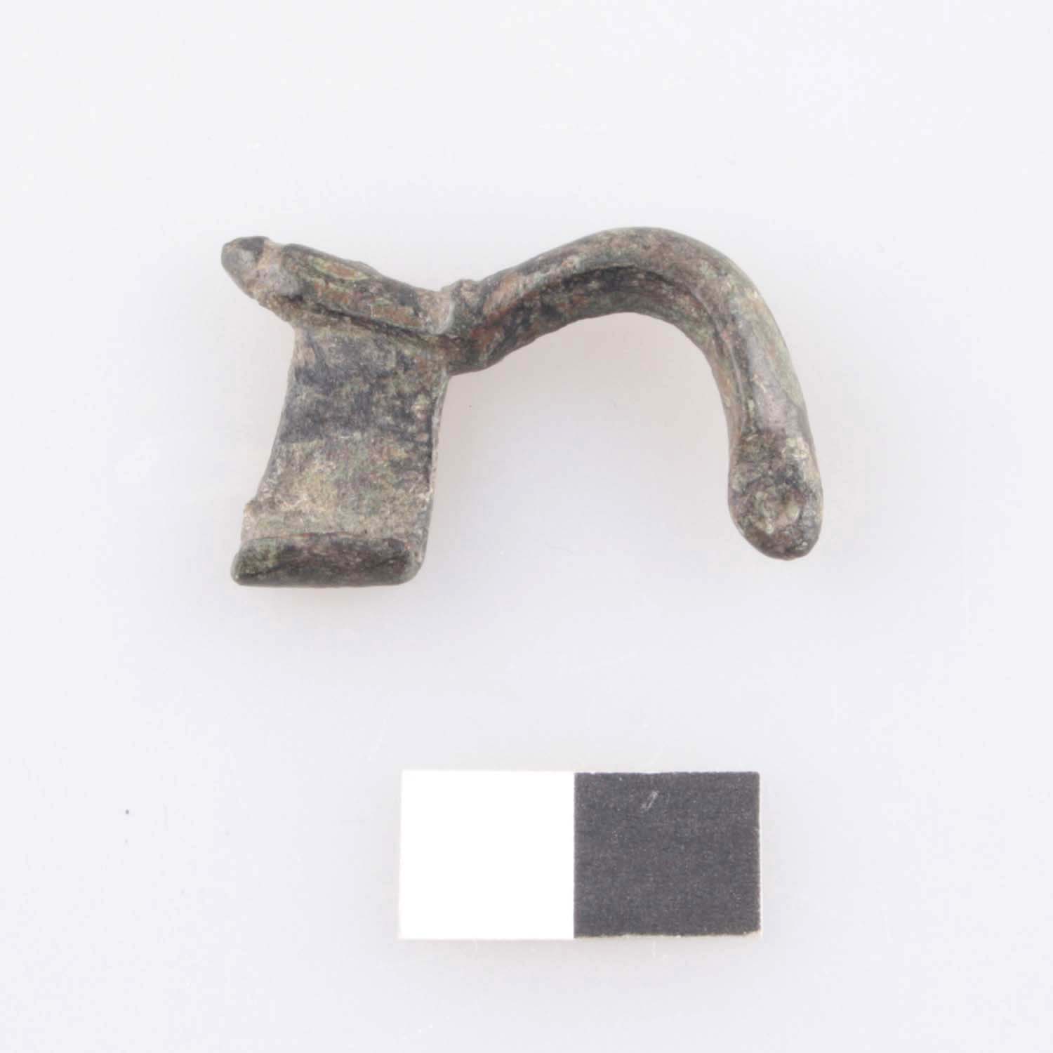 Armbrustfibel mit Fußknopf und massivem Bügel mit Seitengrat, Spiralkonstruktion und Nadel fehlen.
