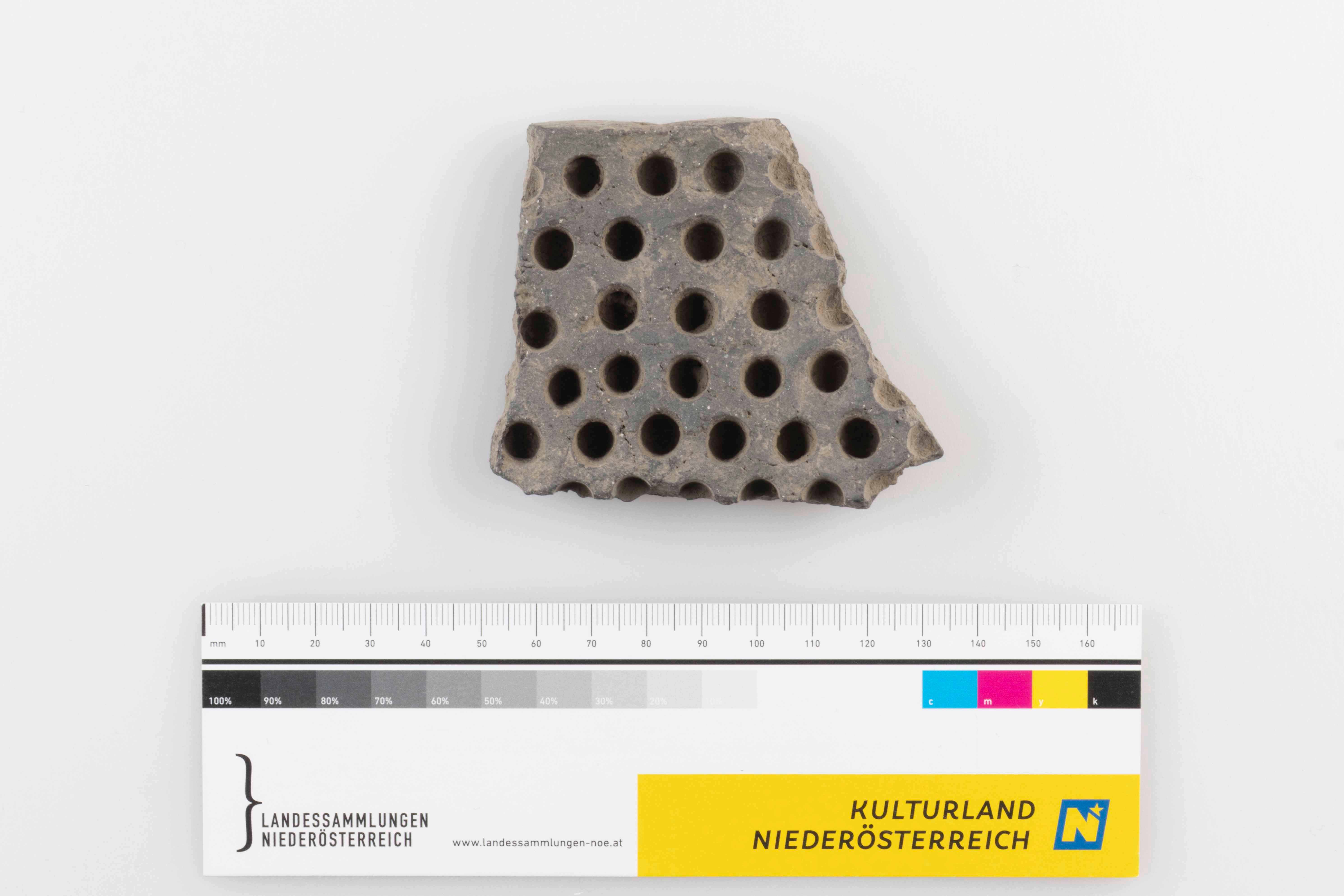 Ein Randfragment einer keramischen Tüpfelplatte, das als bedeutendes Zeugnis für die Münzherstellung in der Zeit der Latènekultur zu betrachten ist. Diese flachen Platten mit Reihen von etwa halbkugelförmigen Vertiefungen wurden für die Massenproduktion von Schrötlingen verwendet. In die Vertiefungen wurde gewogenes Metallgranulat geschüttet und in einem kleinen Ofen geschmolzen, um abgeflachte, kugelförmige Münzrohlinge herzustellen. Die so gefertigten Schrötlinge wurden im nächsten Schritt erneut erhitzt und gehämmert, um die gewünschten Münzrohlingen zu erhalten. Die Münzrohlinge wurden anschließend zwischen zwei Matrizen positioniert und geprägt, wodurch die Münzen hergestellt wurden.