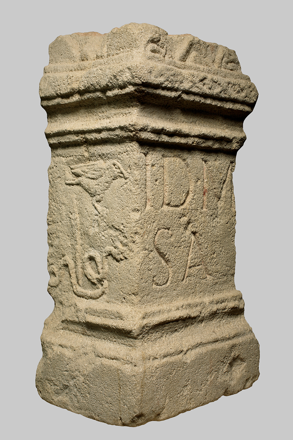 Der Altar wurde in zweiter Verwendung als Hypokaustpfeiler innerhalb des Legionslagers genutzt. Auf der rechten Nebenseite erkennt man einen nach links liegenden Löwen. Auf der linken Nebenseite sind eine Schlange, eine Ähre und ein Rabe abgebildet. Alle drei Figuren sind aktive Teilnehmer beim Akt der Stiertötung des Mithras. Die Vorderseite trägt die Weihinschrift: