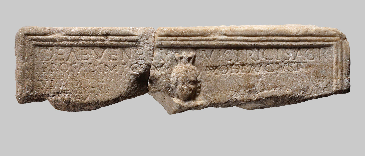 Erhalten ist der obere Teil einer Inschriftplatte mit der Darstellung eines jugendlichen Genius mit Mauerkrone, wohl des Genius der genannten Zenturie. Venus victrix ist die Kultgenossin des Jupiter Heliopolitanus und wurde im Heiligtum auf den Mühläckern wohl ebenfalls verehrt. Aus diesem Heiligtum könnte auch die Inschriftplatte stammen, die in Zweitverwendung aufgefunden wurde. Die Platte trägt folgende Inschrift: