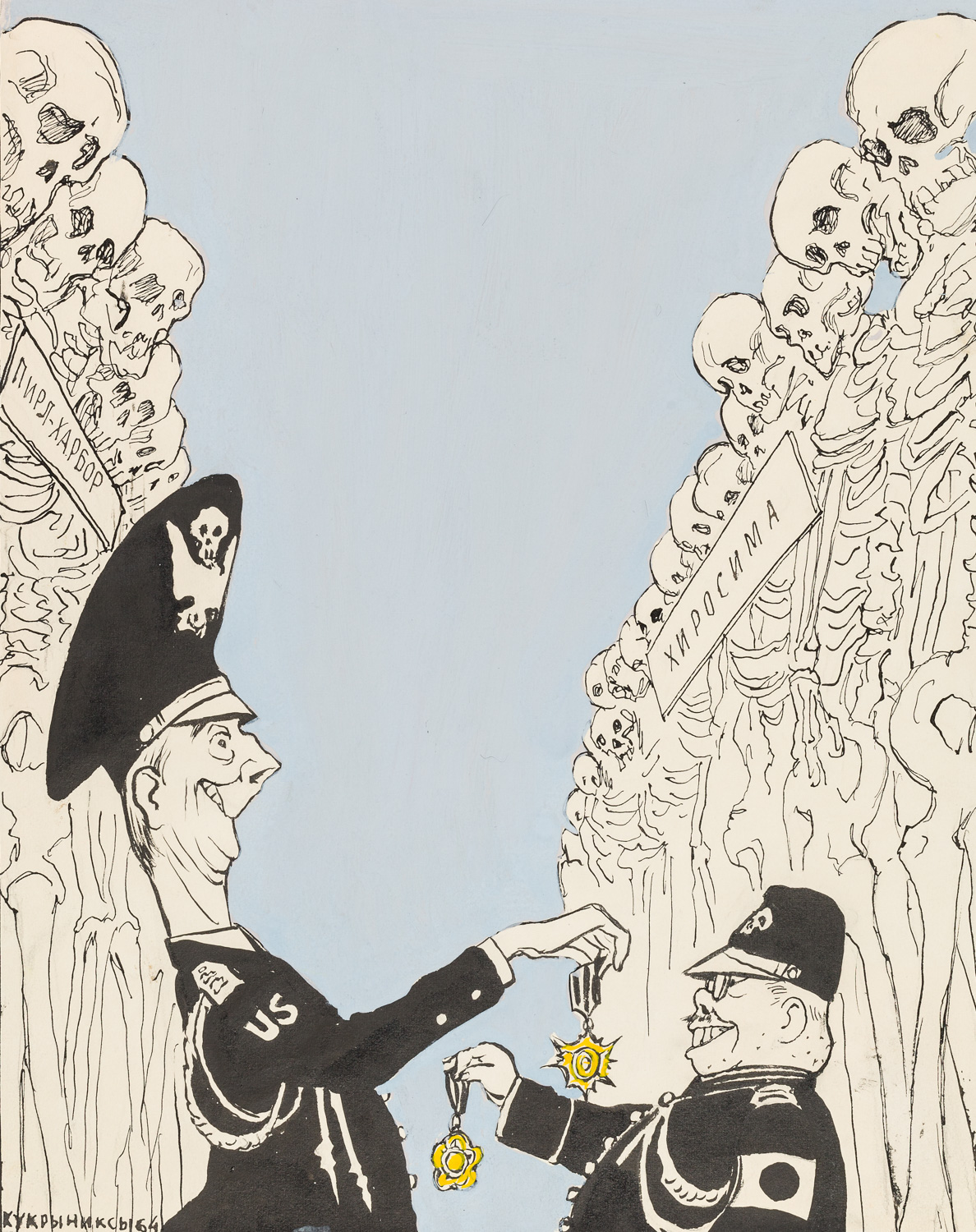 Darstellung: Ein japanischer und ein amerikanischer General zeichnen sich wechselseitig für ihre Verdienste um Hiroshima und Pearl Harbor aus.