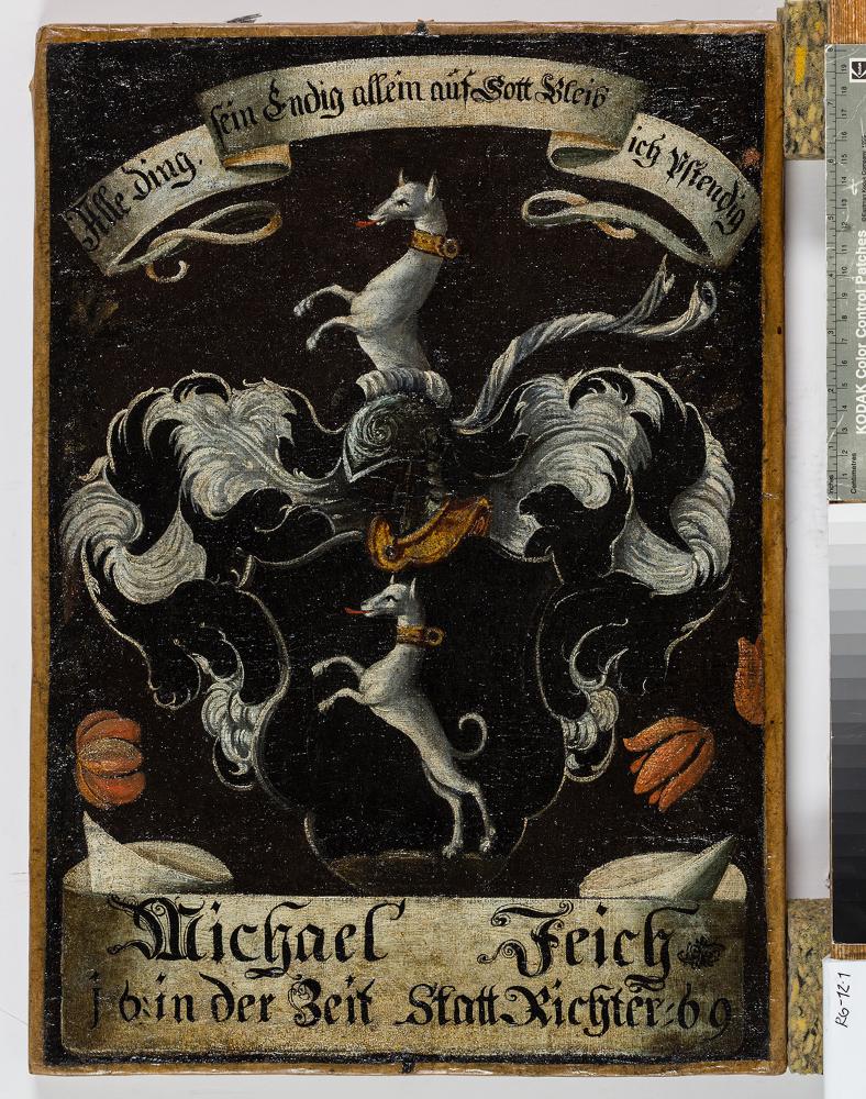 "Michael Feich 16 in der Zeit Stattrichter 69"; über den Enden des Spruchbandes je eine rote Tulpe; oberhalb auf dem Spruchband: "Alle ding sein endig, allein auf Gott bleib ich pstendig."