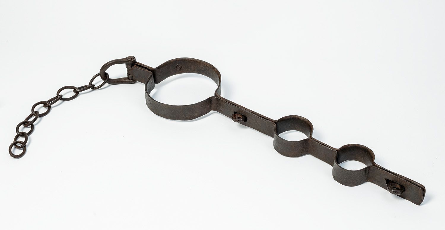 Öffnung für Hals und für die beiden Hände. Halsteil mit einer langen Kette versehen, an der ein eiserner Dübel hängt. Wahrscheinlich war die Strafgeige damit an einem Pranger befestigt.