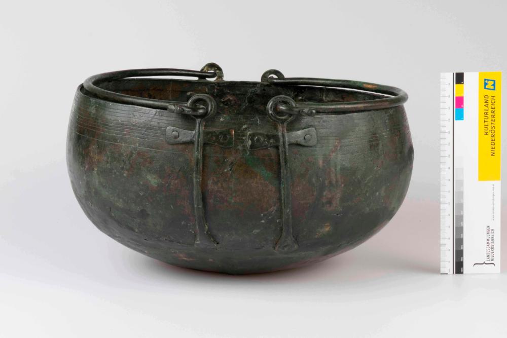 Der halbkugelförmiger Bronzekessel wurde nahtlos in einem Stück getrieben. Der alt gebrochene und leicht gewölbte Boden wurde bereits antik durch Aufnietung von Bronzeblech ausgebessert. Der Rand ist gerade und leicht verdickt. Die Außenseite ist mit vier gleich breiten Bändern verziert, die jeweils aus zwei tief eingeschnittenen Linien bestehen, die um den Rand herum verlaufen. Der Raum zwischen den Linien ist mit feinen Zickzacklinien gefüllt, die an den Enden Dreiecke bilden. Unterhalb dieser vier Bänder befindet sich ein fünftes, das mit hängenden, schraffierten Dreiecken verziert ist. Auf beiden Seiten befinden sich gegenüberliegend zwei vernietete kreuzförmige Bänder, deren Ösen zwei Griffe aufweisen, die in der Mitte rund und an den Enden zu Haken gebogen sind.