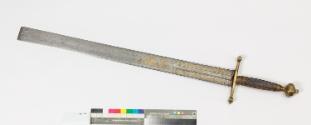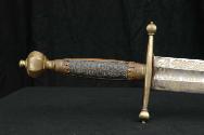 Mit Blutrinne im ersten Drittel; am Ort des Schwertes drei Löcher. In solche Löcher wurden Bleikugeln gelegt, deren Gewicht den Schwung beim Hiebe vermehrte. Griffstück mit Haifischhaut überzogen. Der Knauf achtkantig, die Parierstange in vierkantige Knöpfe endend. Die Klinge besitzt eine reich vergoldete Ätzung in Barockerornamentik.