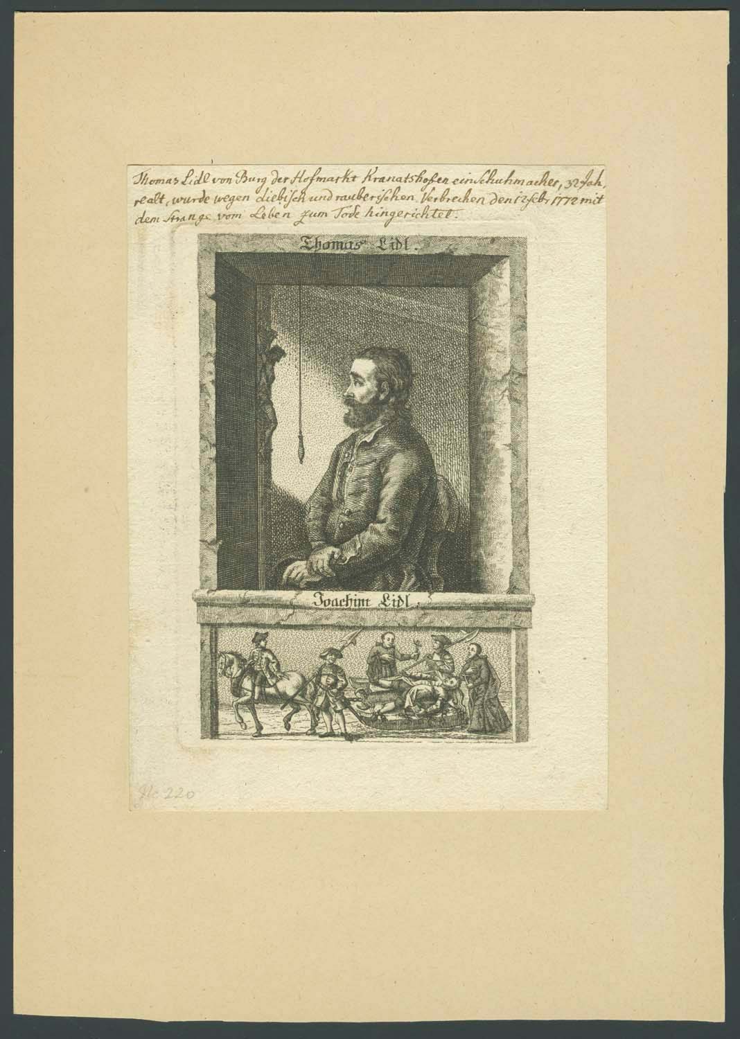 Bildnis des Joachim Lidl, der wegen Mordes verurteilt, zur Richtstätte geschleift wurde, um mit dem Rade hingerichtet zu werden. Unterhalb des Bildnisses ist das Schleifen zur Richstätte dargestellt.