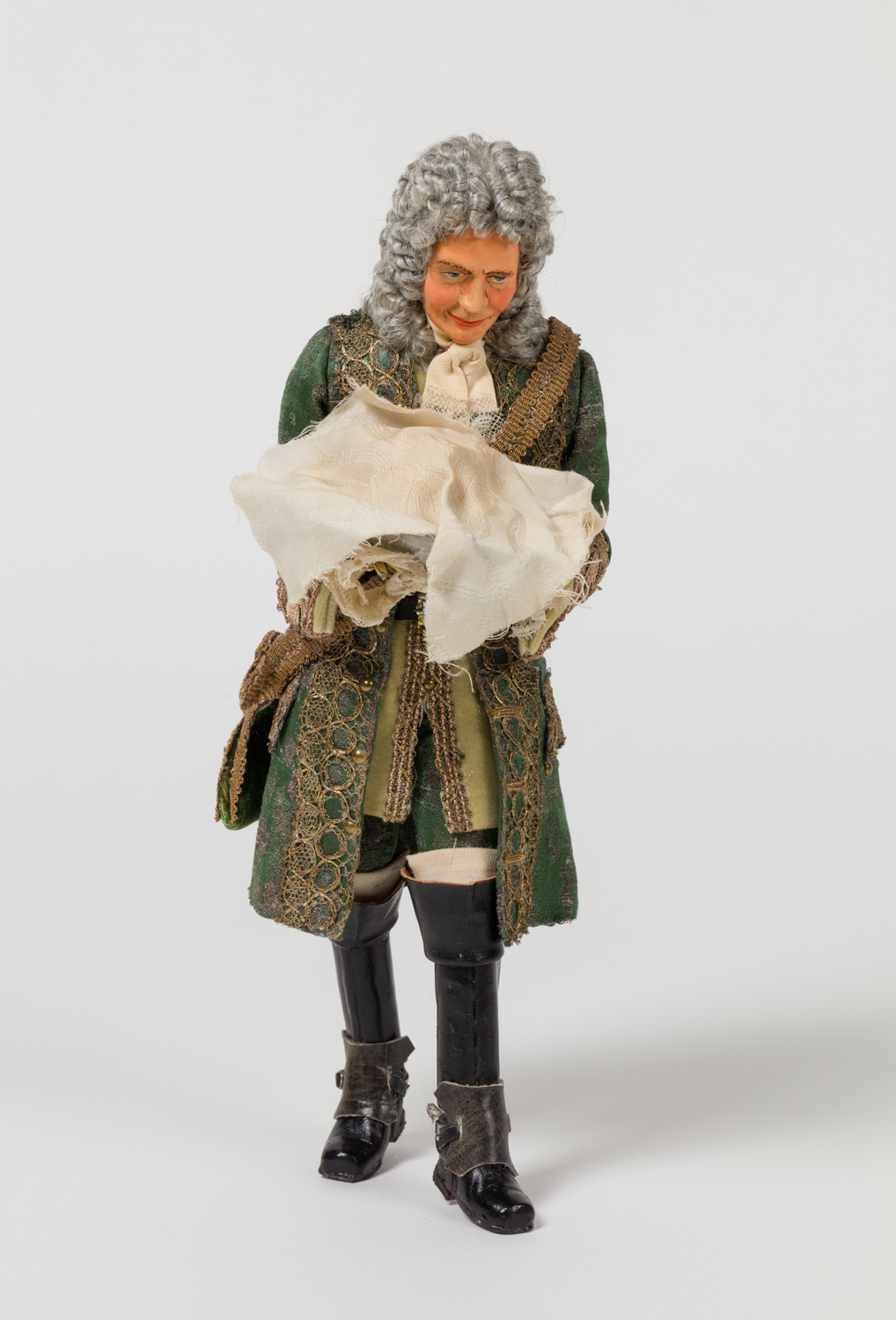 Angehöriger des Hofstaates mit grauer Allonge-Perrücke, goldgewirktem Justaucorps und Coulotten in grün-braunem Atlas, Weste in lindgrünem Samt, weißem Hemd mit Spitzenkragen und -manschetten, weißen Strümpfen, schwarzen Reitstiefeln mit Sporen, weißen Handschuhen, einem Degen und einer goldgewirkten Jagdtasche aus grünem Samt. Er präsentiert dem Kaiserpaar einen mit weißem Leinen zugedeckten Teller mit Brot.