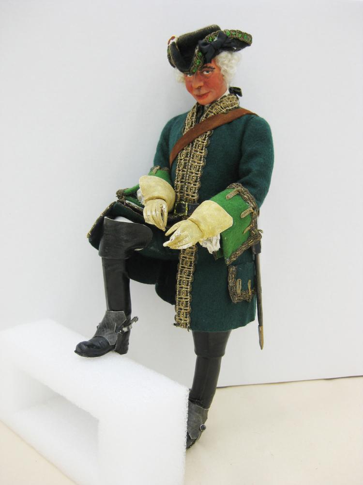 Jagdmeister mit schwarzem Dreispitz mit Hutzier und Schleife, weißer Perücke, grünem Justaucorps, Weste und Coulotten mit Goldborten, weißen Strümpfen, schwarzen Reitstiefeln und beigen Handschuhen, den rechten Fuß auf einen Baumstamm gestellt. Über der Schulter eine Jagdtasche aus braunem Leder, am Halfter ein Jagddegen.