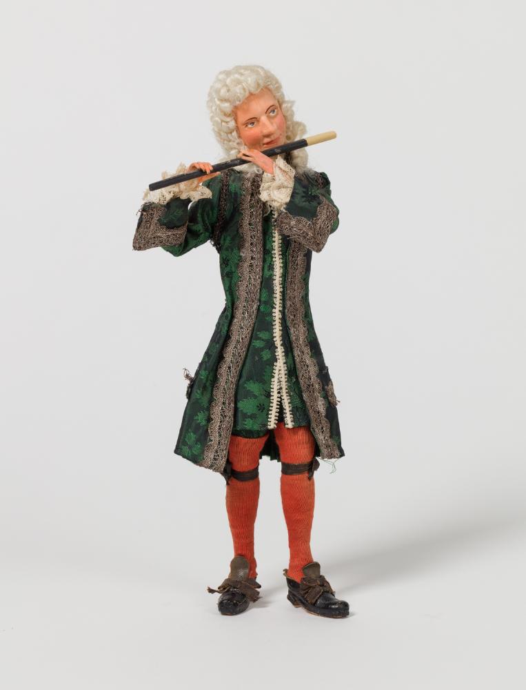 Kammermusiker mit weißer Allonge-Perücke, silbergewirktem Justaucorps und Wams mit weißer Borte sowie Coulotten aus smaragdgrünem Atlas, rote Kniestrümpfe mit schwarzem Strumpfband und schwarzen Schuhen mit großer Schleife, eine Querflöte spielend.