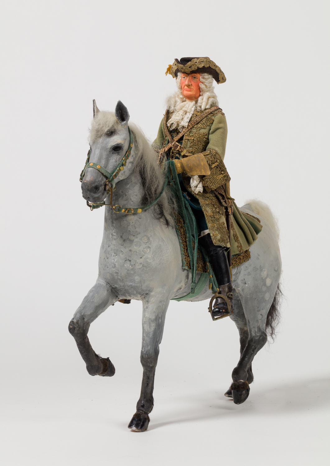 Angehöriger des Hofstaates, vermutlich der Oberhofjagdmeister, mit schwarzem, goldverbrämten Dreispitz mit Hutzier, weißer Allonge-Perücke, goldgewirktem Justaucorps, Wams und Coulotten in smaragdgrünem Samt, weißen Strümpfen und schwarzen Reitstiefeln sowie braunen Handschuhen. An über Kreuz hängenden Halftern links eine Jagdtasche mit Fernrohr und rechts ein Jagddegen, die linke Hand hält die Zügel, die rechte einen Spazierstock mit Troddeln. Auf dem grauen Schimmel in Trab ein Sattel aus smaragdgrünem Samt mit goldenen Borten.