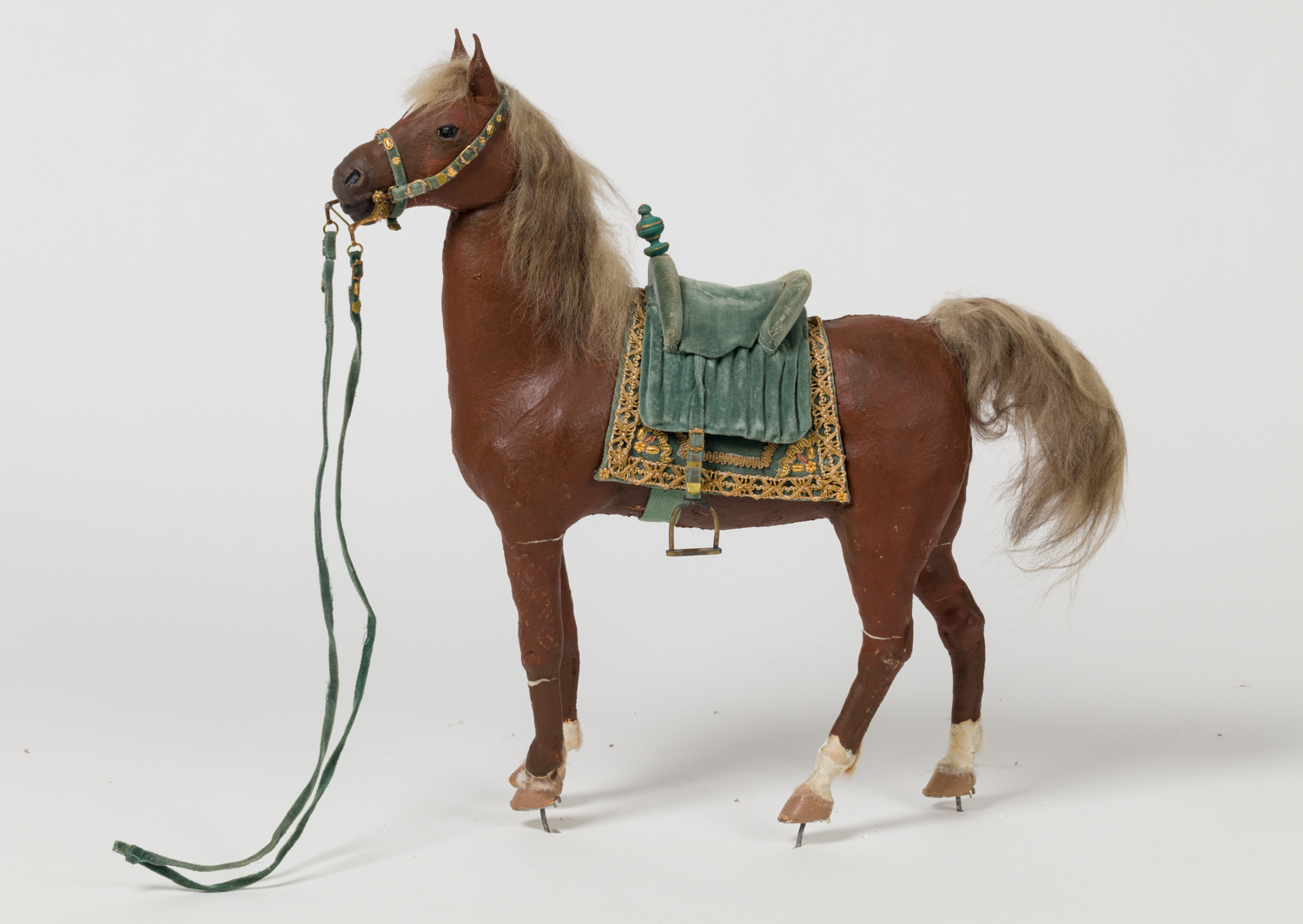 Braues Pferd mit Prunksattel aus türkisgrünem Samt, mit Goldborten besetzt.
