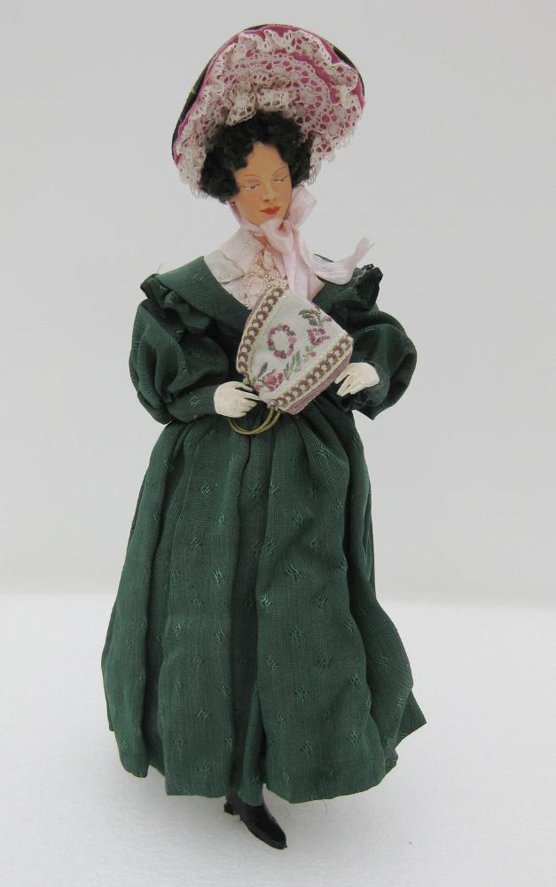 Großbürgerliche Dame mit schwarzen Locken, ausladender Schute mit hoher Krone aus schwarz-gelbem Seidenatlas mit rosa Bändern und Futter sowie weißem Spitzenbesatz, blaßrosa Bluse mit Rüschenbesatz, Kleid aus grünem Seidenatlas mit gerüschter Berthe, Gigot-Ärmeln und Wespentaille mit Gürtel und goldener Schnalle, weißen Handschuhen, weißem Kriolinrock, weißer Unterwäsche, weißen Strümpfen und schwarzen Schuhen. Am rechten Arm trägt sie eine floral bestickte Beuteltasche.