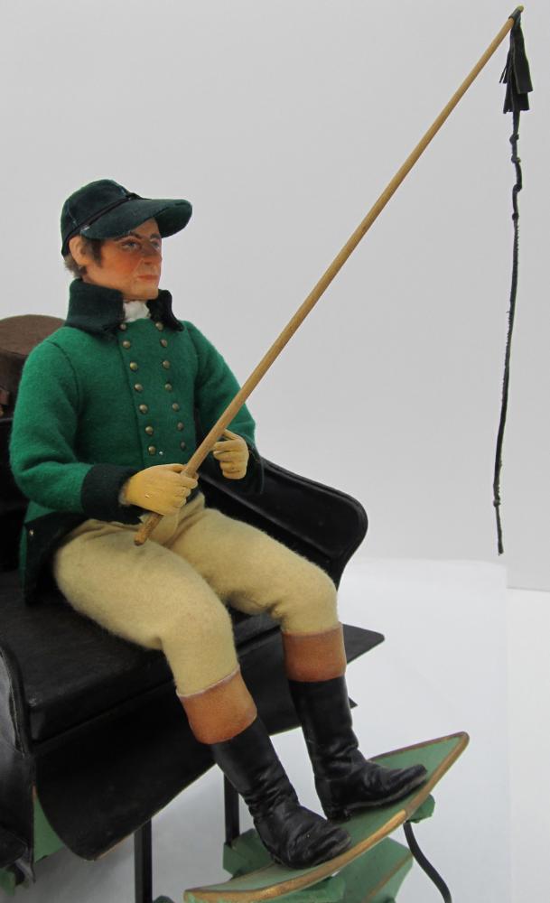 Kutscher mit grünem Kostüm und Peitsche in rechter Hand