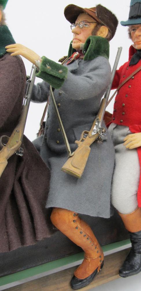 Jäger mit brauner Fellkappe, grauem Mantel und Brillengläsern; vierte Reihe von vorne.