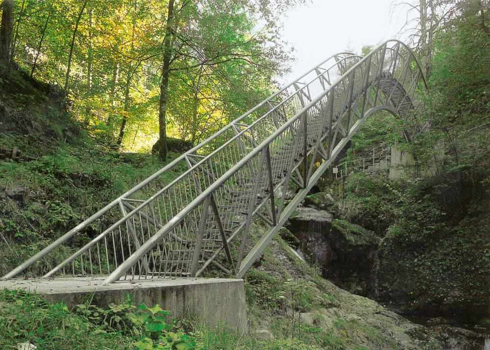 Die Initiative für den Übergang ergriff der junge Ybbsitzer Schlossermeister Franz Wahler, industriegeschichtlich engagierter Besitzer der "Jubiläumssschleife" an den Wasserfällen "In der Noth" im Zuge der Ybbistzer Schmiedemeile. Mit dem Architekten Robert Schwan entwickelte er einen stählernen Steg von ca. 23 m Spannweite. Die statisch konstruktiven Aspekte betreute der Bauingenieur Alfred Schaufler. Die Brücke schwingt sich an jener Stelle in die Höhe, wo man den Wasserfall erstmals von nahe sieht. Eine luftige Stiege hängt zwischen zwei V-förmig auseinanderstrebenden, zu Bogen gekrümmten Fachwerkträgern, steigt steil hinauf zum Scheitel, um mit wenigen abwärts führenden Stufen wieder den Boden zu erreichen. Der flache Bereich im Bogenmaximum verführt zum Innehalten und Schauen. Daher verläuft die Brückenachse nicht rechtwinklig zur Klamm, sondern schräg, sodaß der Raum über dem Wasserfall durchschritten werden kann. Der Steg ist in mehrfacher Hinsicht bedeutsam: Im Verhältnis zur Landschaft, einer Filigranität, in der statisch-konstruktiven Konzeption, im Verhältnis von tragenden und dienenden Teilen und nicht zuletzt deshalb, weil er als zeitgenössisches Bauwerk zugleich Produkt beruflichen Stolzes und industriearchäologischen Interesses örtlicher Handwerker ist. Damit gewinnt das Brückenbauwerk Eigenständigkeit in Raum und Zeit und überspielt die dienende Rolle eines reinen Zweckbaus.
