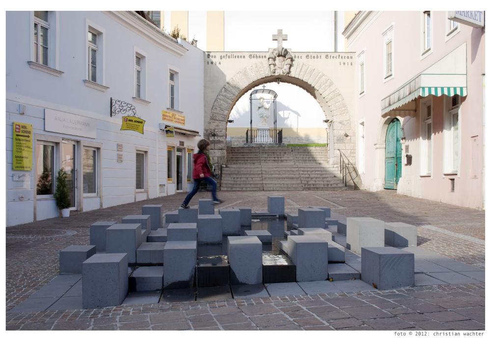Ausgangspunkt für Peter Sandbichlers Skulptur Schwarze Schafe ist die Legende des heiligen Koloman. Es handelt sich dabei um die Geschichte eines Pilgers, der auf seiner Reise von Irland ins Heilige Land Halt in Stockerau gemacht hat. Aufgrund seiner Andersartigkeit, seiner fremden Sprache und Kleidung, wurde der Reisende für einen Vaterlandsverräter gehalten und von den Einheimischen zum Tode verurteilt. Die Legende besagt, dass sein Leichnam nicht verwesen wollte und dass sich zahlreiche Wunder um seinen Körper eingestellt haben sollen. Dies ist auch der Grund, warum Koloman in der damals neu errichteten Kirche in Stockerau beigesetzt und später heilig gesprochen wurde. Die Geschichte von Koloman steht bis heute für Rassismus und Fremdenfeindlichkeit und seine Reliquien gelten als Mahnmal. Mit Schwarze Schafe knüpft Peter Sandbichler jedoch nicht nur bei der Stadtgeschichte an, sondern auch beim baulich-architektonischen Gefüge des Kleinen Marktplatzes, an dem der Brunnen installiert wurde. Das Straßenpflaster des historischen Kerns von Stockerau hat der Künstler in Form von Betonquadern im Brunnen wiederaufgenommen. Die unterschiedlichen Höhen der grauen Elemente, die sich auf den ersten Blick fast unsichtbar in das Gesamtbild des Platzes einschreiben, bilden ein Sammelbecken für frisches Wasser. Der leicht abschüssige Boden wird vom Künstler dazu verwendet, das gesammelte Wasser als nivellierendes Element im Brunnen einzusetzen. Was Höhe ist wird zur Niederung und was Niederung ist wird zur Höhe. Mit 140 Betonkuben wirkt Peter Sandbichler dem Gefälle des Geländes entgegen – er leistet ihm Widerstand. Abgesehen von der stadtgeschichtlichen und räumlichen Situation nimmt Peter Sandbichler mit Schwarze Schafe aber auch auf die Funktion des Kleinen Marktplatzes Bezug. Selbst wenn dieser Platz in der Geschichte von Stockerau einmal ein Ort sozialer Interaktion gewesen sein muss, so wurde er in den vergangenen Jahren nur wenig von den BewohnerInnen als solcher genutzt. Es handelt sich dabei um einen Durchgangsort, dem keine besondere Funktion innerhalb der sozialen Gemeinschaft zugeschrieben wird. Ähnlich wie Sandbichler dem Gefälle des Bodens durch das Arrangement der Betonkuben entgegenwirkt, wirkt er mit der Positionierung des Brunnens innerhalb der Stadt der Funktionslosigkeit des gesamten Platzes entgegen – auch in diesem Fall leistet er Widerstand. Peter Sandbichler errichtet mit Schwarze Schafe eine Skulptur, die das Potenzial für soziale Interaktion hat. Einzelne Elemente laden zum Sitzen und Verweilen ein, sie dienen Gesprächen zwischen den Bewohnerinnen von Stockerau, sie dienen dem Austausch mit Freundinnen und Bekannten, sie dienen aber auch – ganz im Sinne des heiligen Koloman, dessen Statue sich im Wasser des Brunnens reflektiert – dem Austausch mit dem Unbekannten, Fremden und Anderen. Peter Sandbichler unterbreitet den Bewohnerinnen von Stockerau mit Schwarze Schafe einen Vorschlag. Ob sich die Betrachterinnen des Brunnens darauf einlassen, ob sie ihre Position von Betrachterinnen in Benutzerinnen verwandeln, ob sie das Mahnmal gegen Fremdenfeindlichkeit zur Diskussion nutzen und Widerstand leisten und ob der Brunnen schließlich ein "Anknüpfungspunkt im richtigen Leben" der StockerauerInnen wird, liegt bei den Einzelnen. (Franz Thalmair)