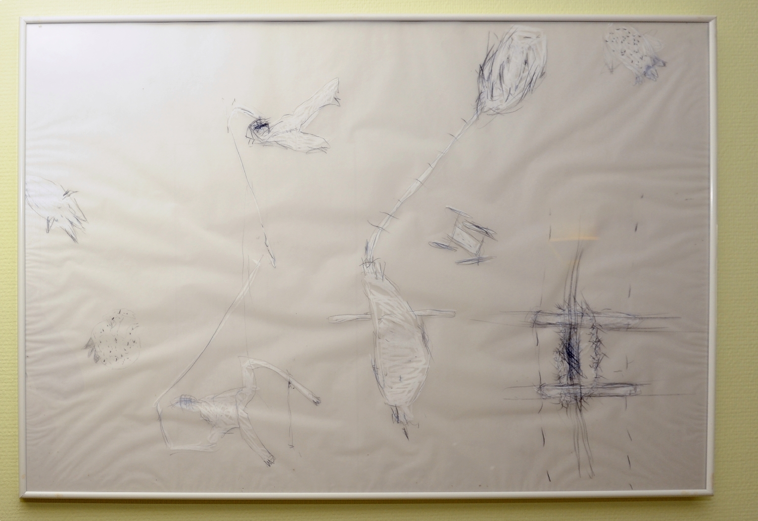 Emi Rendl-Denk benutzt Transparentpapier, weil dadurch auch noch eine dahinterliegende Ebene sichtbar wird, quasi im kleinsten Abstand mindestens drei verschiedenste Sichweisen klar werden müssen. Ihre Gestaltung ist assoziativ, hat mit konkreten Elementen ebenso zu tun wie mit Symbolen, zeigt ihr Verhältnis zur Grundlagenforschung: Was Farbe kann, der Konturenstift vermag und wie Ölkreide dagegensteht, ja die zufällig durch Lagerung entstandenen Veränderungen (Abfärbung, Knitterung, Temperaturreaktion) sind ebenso Teil des Ganzen wie die verschiedenen, teilweise ungewöhnlichen Größen, die zeigen, was sich mit Formaten verändern kann.