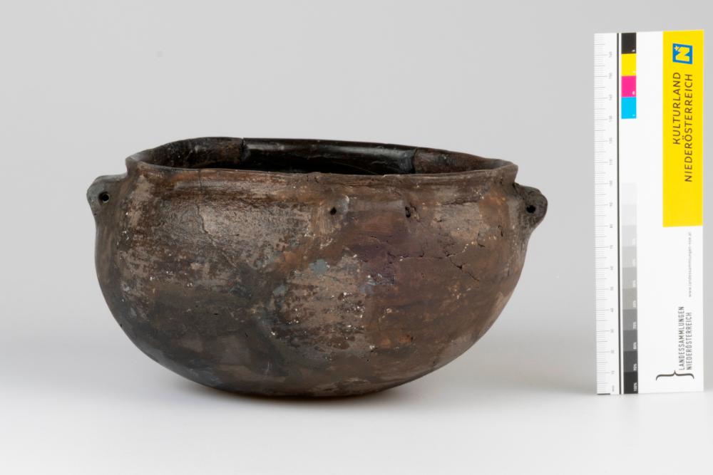 Der Schüssel weist eine unverzierte Oberfläche auf und ist durch einen leicht ausgebogenen Rand charakterisiert. Das Gefäß besitzt vier annähernd kreuzförmig angeordnete, horizontal gelochte Ösen. Es wurde partiell ergänzt.