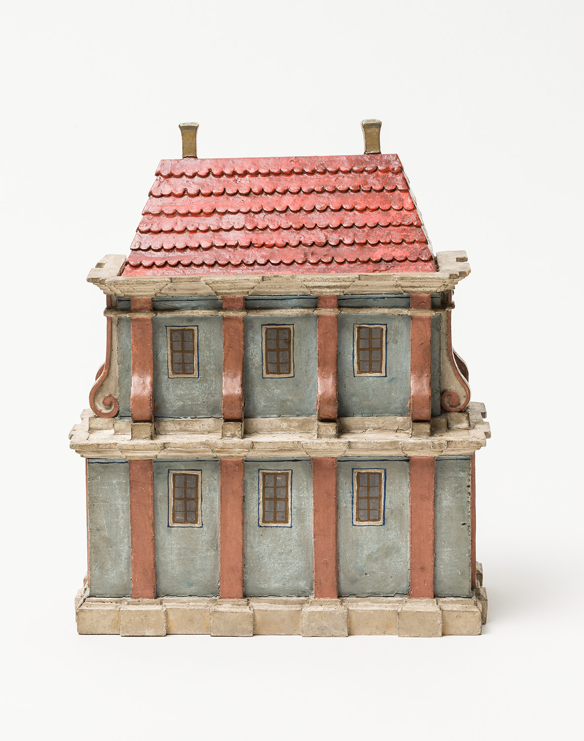 Zweigeschoßiges blaues Gebäude mit weinroten Unterteilungen, im Obergeschoß als Voluten ausgeführt, mit einem roten Dach und zwei Schornsteinen.