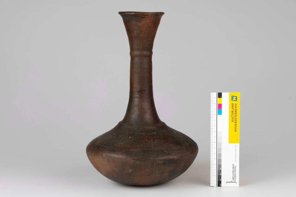 Eine scheibengedrehte Linsenflasche aus rötlichbraunem, steinchengemagertem, glänzend geschlickertem Ton. Sie hat einen ebenen Boden, ein kalottenförmiges Unterteil, einen markanten Bauchknick, ein konisch zulaufendes Oberteil, einen hohen, annähernd zylindrischen Hals und einen ausladenden Mundsaum. Sowohl am Halsansatz als auch am Mundsaumansatz befinden sich umlaufende Tonwülste.