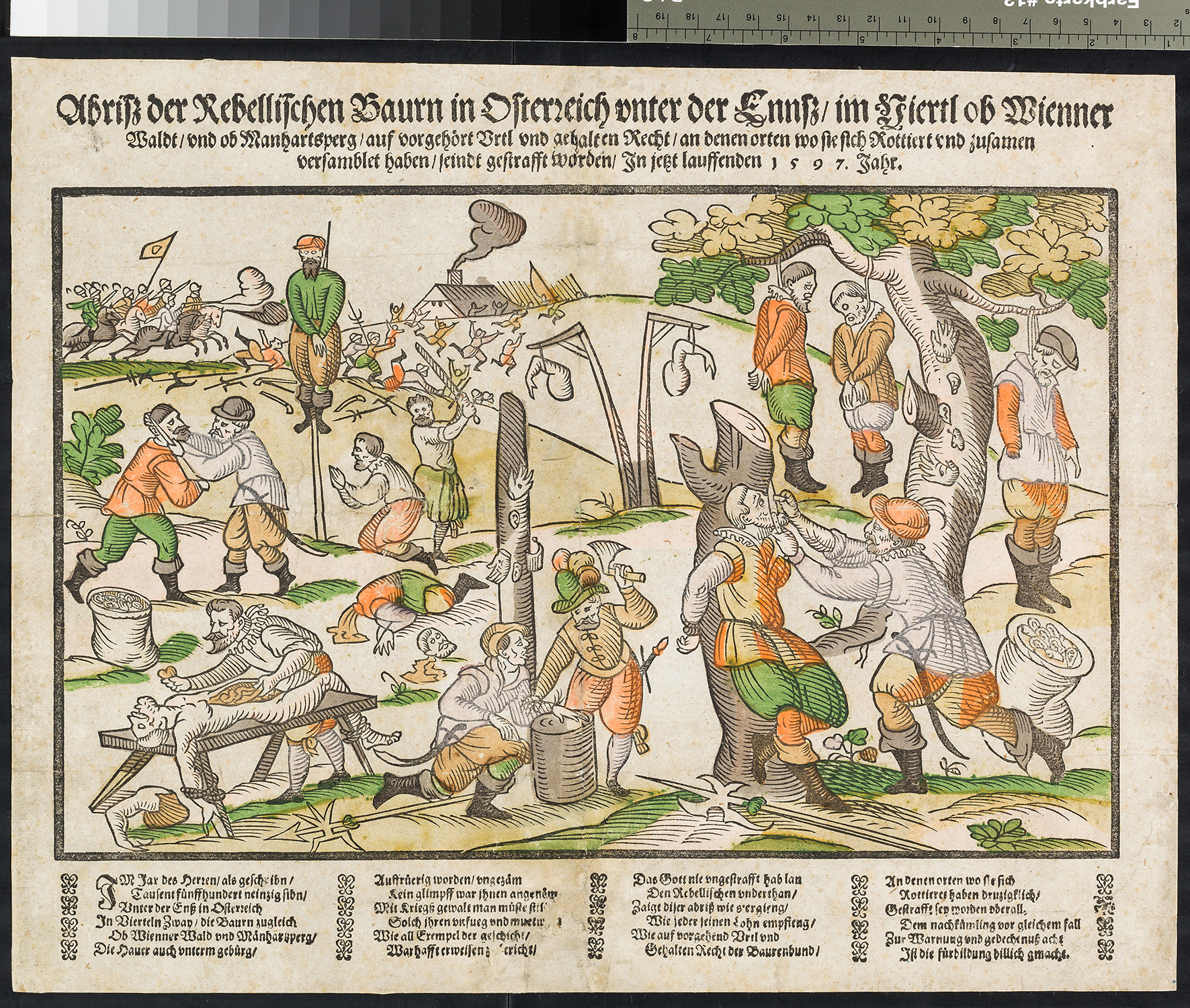 "Abriss der Rebellischen Baurn in Osterreich unter der Ennse / im Viertl ob Wienner Waldt / und ob Manhartsberg / auf vorgehört Urtl und gehalten Recht / an denen orten wo sie sich Rottiert und zusammen versamblet haben / seindt gestrafft worden / In jetzt lauffenden 1597 Jahr."
