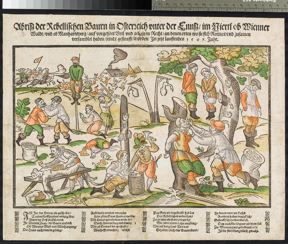Der Bauernaufstand 1596/97 in Niederösterreich brach vor allem im "Viertel ober dem Manhartsberg" und im "Viertel ober dem Wienerwald" aus. Dem Bauernaufstand ging der Aufstand im Herzogtum „Österreich ob der Enns“ (1594-1597) zuvor. Der Auslöser war 1596 in der Stadt Steyr, wo die Musterung „des zehnten Mannes“ verweigert wurde und Hinrichtungen folgten. Daraufhin brach ein Aufstand aus, der in das heutige Niederösterreich übergriff, wo es um die Rechte der bäuerlichen Bevölkerung nicht besser stand. Die Auflehnungen wurde mit äußerster Grausamkeit von den kaiserlichen Truppen und seinem Söldnerherrn niedergeschlagen, wie die Abbildung zeigt. Neben Hinrichtungen wurde auch „Verstümmelungs-“ und „Schandstrafen“ durchgeführt, wobei die Bestrafungen in den Orten vollzogen wurden, wo die Aufständischen lebten. Der Holzschnitt dokumentiert diese Bestrafungen und Grausamkeiten gegen die bäuerlichen Aufständischen und wurde zur Abschreckung der Bevölkerung erstellt.