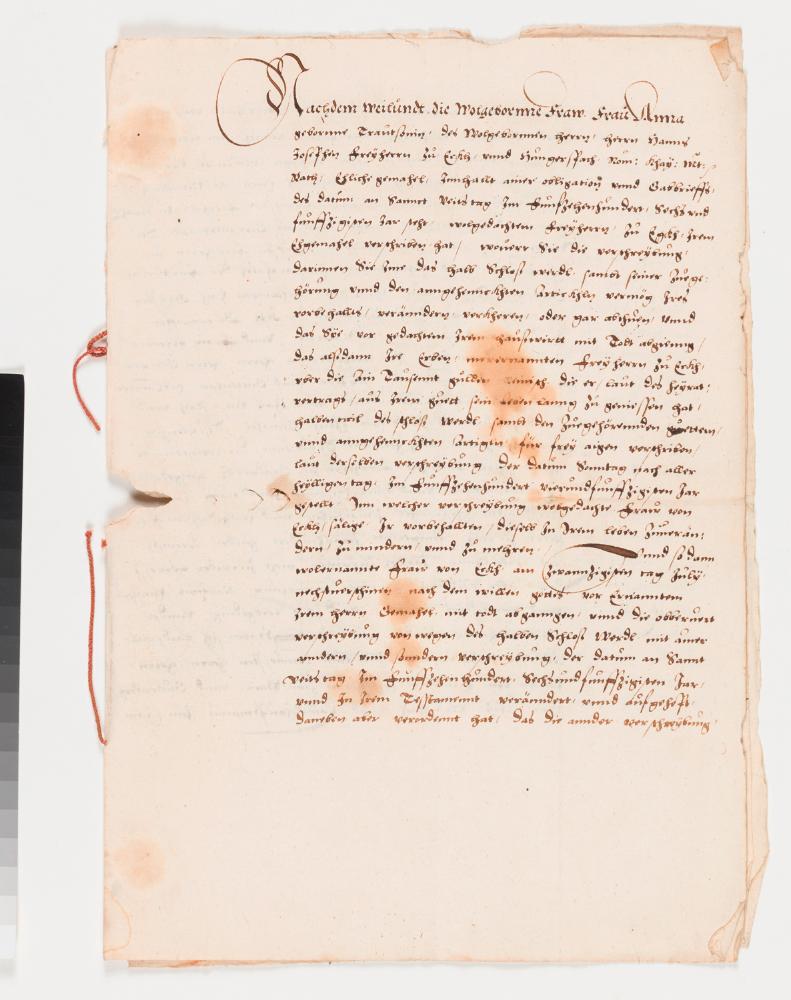 Technische Details4 Blatt, 8 Seiten, geheftet mit roter Kordel in Dreistichheftung, deren Enden unter 8 Oblaten-Siegeln fixiert sind