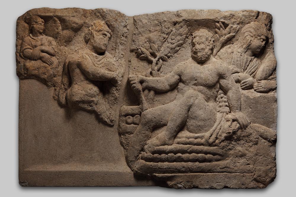 Das Relief stammt von einem großen Grabbau und zeigt eine Szene aus der Mythologie: Hercules sitzt auf dem Scheiterhaufen und übergibt den siegbringenden Bogen an seinen Freund Philoktet, der ihn auf dem Scheiterhaufen lebend anzünden soll. Links neben Philoktet sitzt die mit Helm und Schild bewaffnete Göttin Athena und beobachtet das Geschehen aus der Entfernung. Sie wird Hercules aus den Flammen in den Olymp geleiten und in den Kreis der Unsterblichen einführen. Die rechts oberhalb des Hercules dargestellte weibliche Figur wendet sich einer weiteren Figur liebevoll zu. Es könnte sich um das Paar Hyllos und Iole handeln, oder um Hebe, die Tochter der Hera und Göttin der ewigen Jugend, die Hercules heiraten wird. Die Reliefszene drückt in diesem Sinne einen Erlösungsgedanken aus.