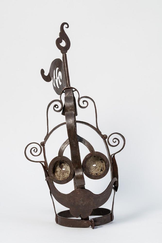 Die Maske besteht aus rund 2,5 cm breiten flachen Eisenbändern, von denen je eines über das Gesicht, den Nacken und die Ohren des Inculpanten verläuft. Die Verbreiterungen über den Ohren sind nach außen hochklappbar, das Vorderstück trägt einen eisernen Zapfen, der vom Delinquenten in den Mund zu nehmen war, über die Augen legte sich eine brillenartige Vorrichtung mit ganz kleinen Sehschlitzen. Schneckenartige eingerollte Eisenbänder dienen als Verzierung. Über dem Scheitel ist ein Glöckchen, welches bei jeder Bewegung des Delinquenten läutete und eine Art von Wetterfahne mit einem geöffneten Wolfsrachen angebracht.