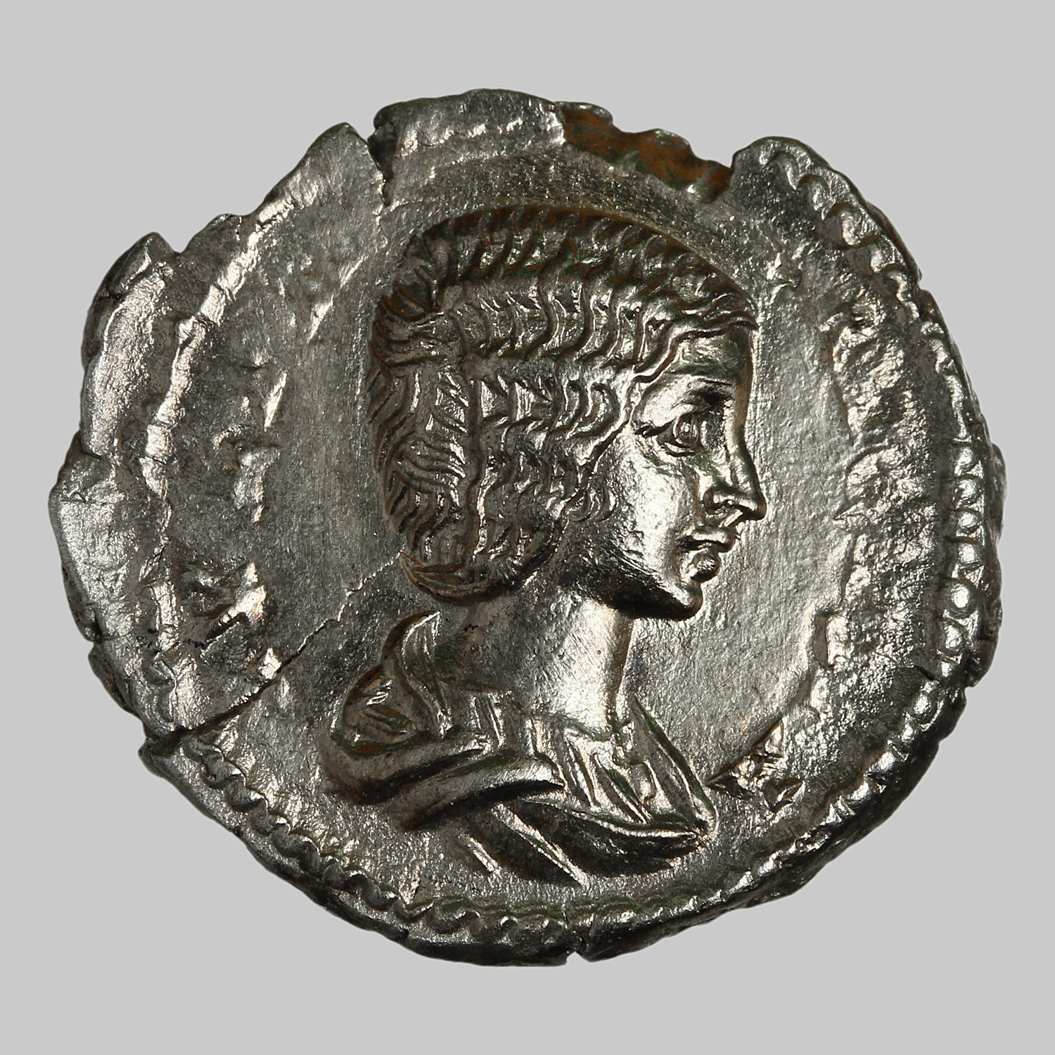 Isis steht n. r., stellt den linken Fuß auf Schiffsbug (prora), hält Horus an ihre Brust, links ein Altar mit einem angelehnten Steuerruder