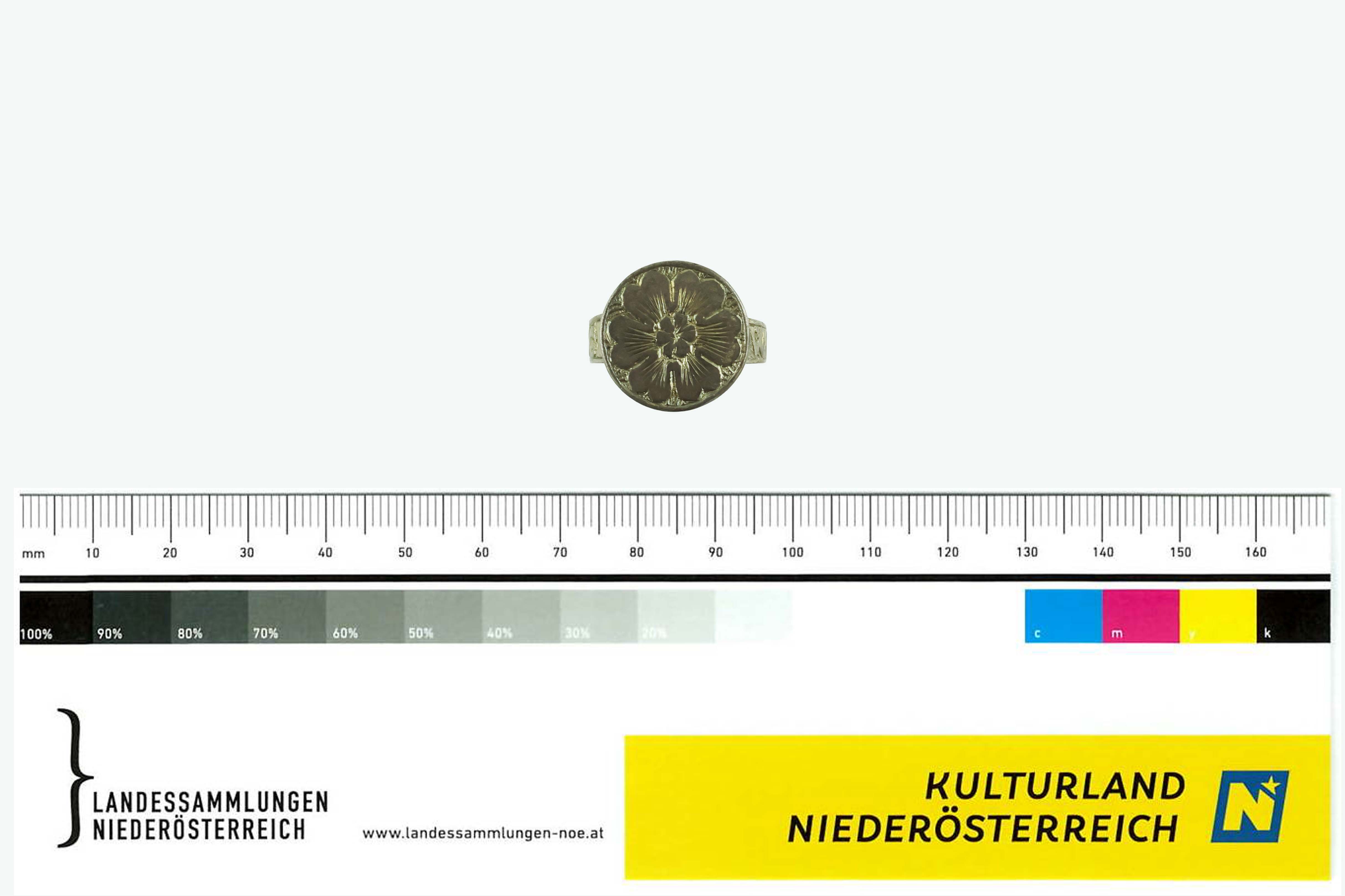 Vergoldeter Silberring mit Ringplatte. Die runde Ringplatte zeigt ein Motiv in Form einer doppelten Blüte mit sechs äußeren und sieben inneren Blütenblättern. Die äußeren Blütenblätter sind mit radialen Strichverzierungen versehen, während die inneren Blütenblätter erhaben und ebenfalls mit radialen Strichverzierungen versehen sind. Der Hintergrund der Ringplatte ist kreuzschraffiert und erhaben. Die massive Ringschiene verfügt über einen flachrechteckigen Profilquerschnitt und ist zur Schulter hin breiter. Auf der Ringschiene befindet sich die Inschrift "WOLMICHEINRASGI". Die Buchstaben sind glatt auf dem kreuzschraffierten Hintergrund aufgetragen. Die Ringschiene ist an der Unterseite der Ringplatte befestigt.