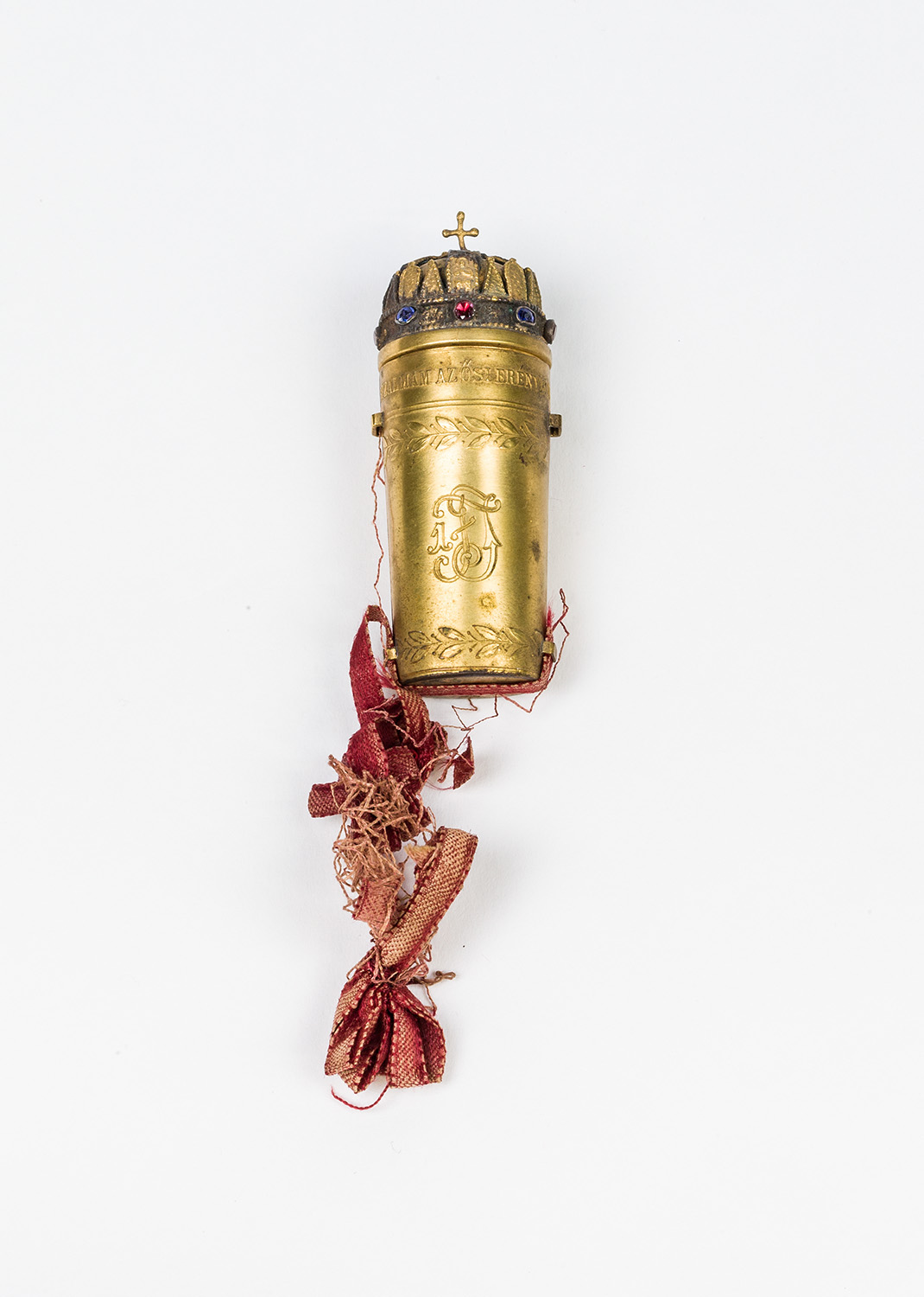 Kaiser Franz Joseph als König von Ungarn - Behälter für ungarische Krönungserde, Messing vergoldet, oval nach oben konisch geweitet, Wandung mit umlaufendem Lorbeerband und graviertem Monogramm "FJI", Inschrift: "BIZALMAM AZ ÖSI ERENY BEN" (Mein Vertrauen in die Urtugend), Scharnierdeckel in Form der heiligen ungarischen Stephanskrone, mit farbigen Glassteinen geschmückt, Boden mit Nummer 85 und Firmenzeichen der Silberwarenfabrik Szandrik, Budapest, um 1867. Anhängende Seidenmasche. Diese Behälter wurden mit Erde des ungarischen Krönungshügels - welche aus allen Komitaten nach Budapest gebracht wurde - gefüllt. Die Behälter mit der geweihten Königserde wurden an einer Schnur an der Brust getragen.