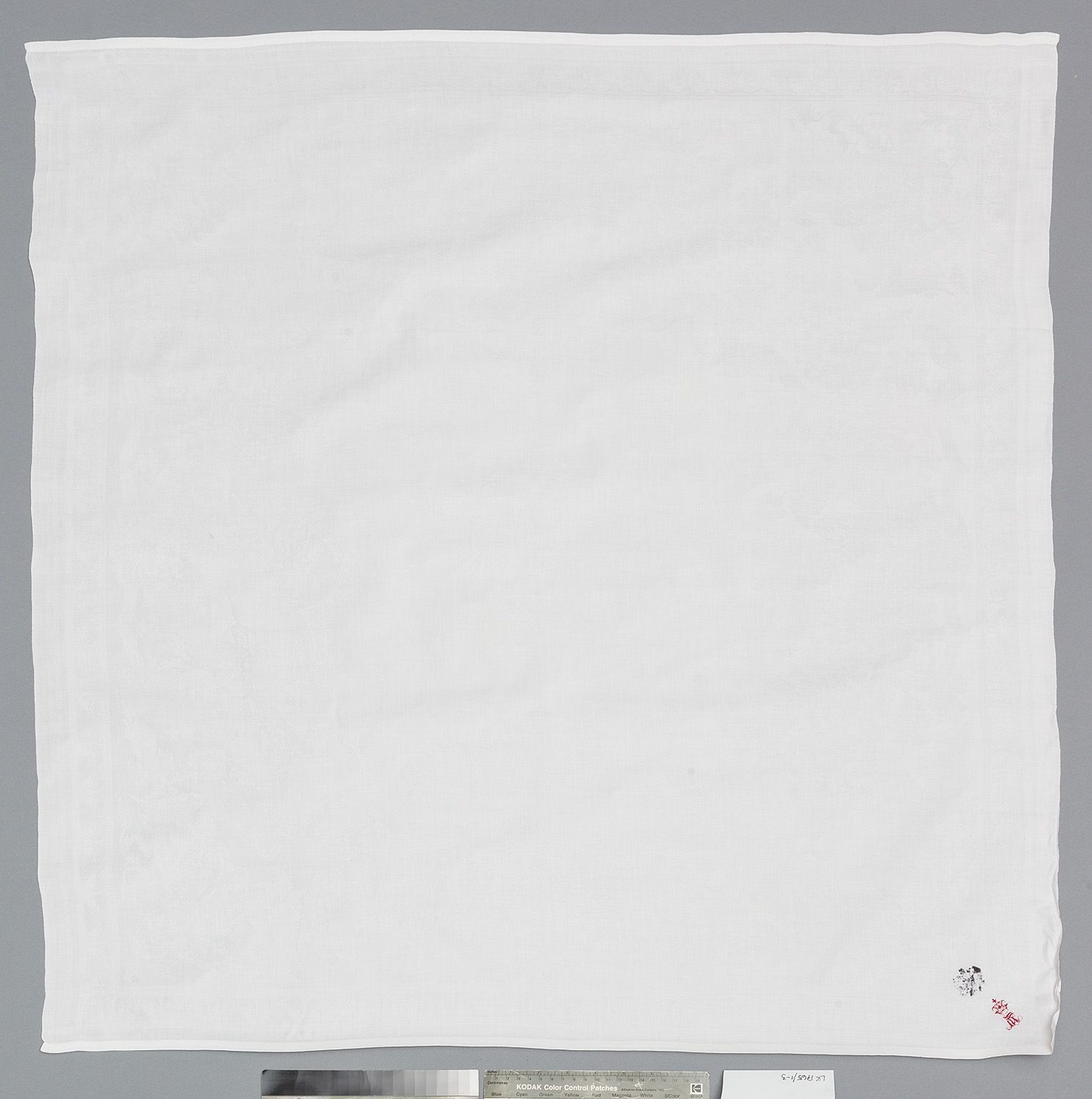 Serviette aus der Hofwäschekammer. Leinendamast, im Zentrum eingewebter kaiserlicher Doppeladler, in den Ecken jeweils der von zwei Greifen gehaltene Schild mit kaiserlichem Doppeladler, rot eingesticktes Monogramm "FJI" mit Kaiserkrone sowie schwarz gestempelter Doppeladler, um 1900