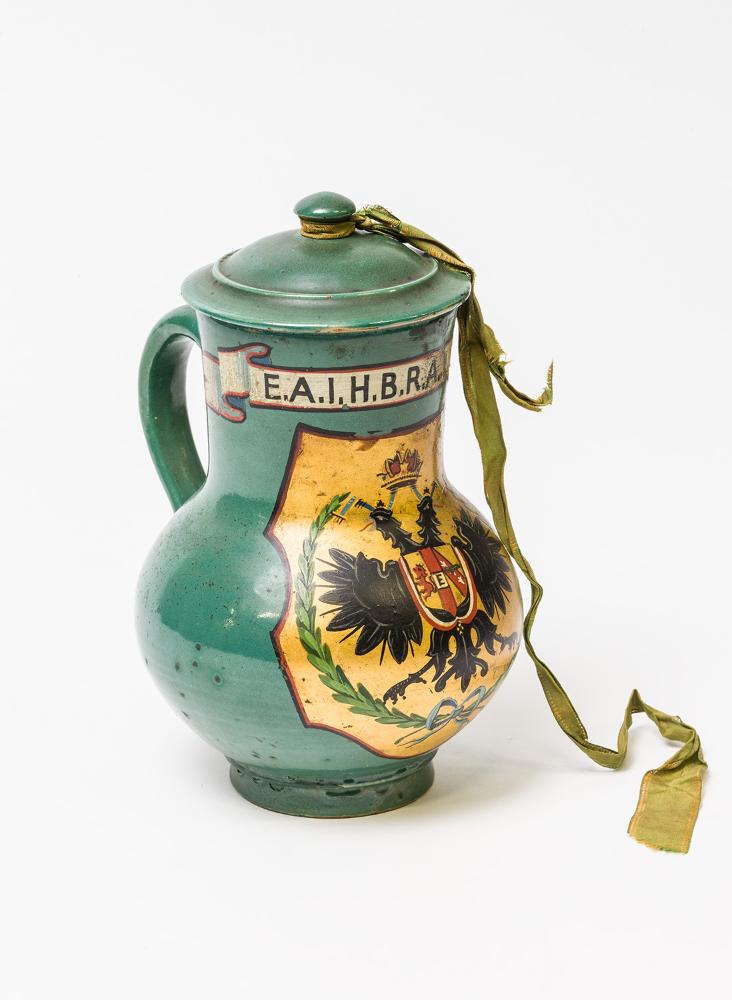 Kaiserin Elisabeth - Fußwaschungskrug 1896. Keramik grün glasiert, rund, gebaucht, in Kartusche kaiserlicher Doppeladler, Schriftband "E.A.I.H.B.R.A.A.1896 (Elisabeth Austraie Imperatrix Hungariae Bohemiae Regina Achiducessa Austriae), mit Deckel (daran ist ein grünes Seidenband befestigt)
