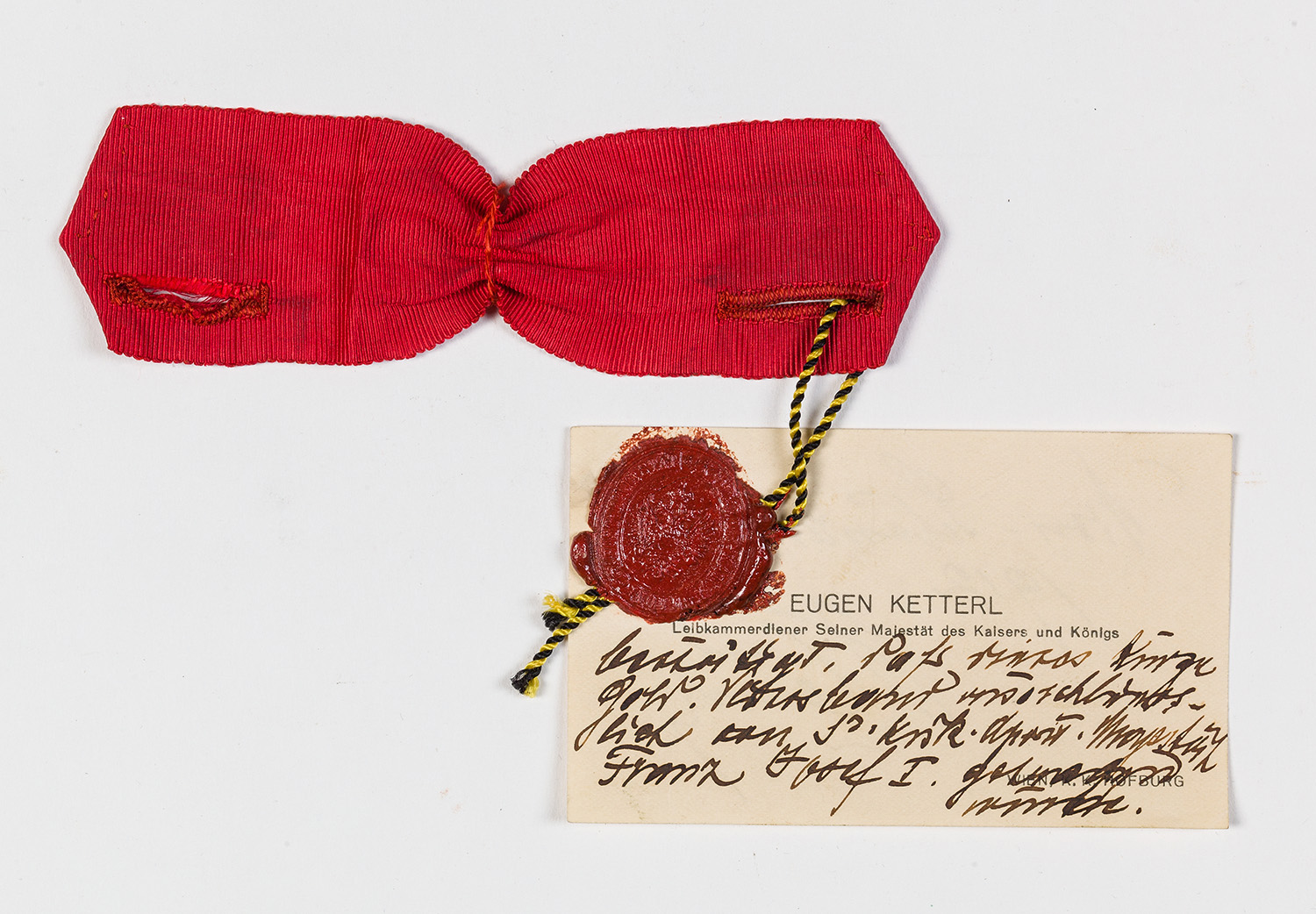 Kaiser Franz Joseph - Persönliches Ordensband zum Orden vom Goldenen Vlies. Kurzes rotes Seidenripsband, anhängend Visitenkarte des Leibkammerdieners Eugen Ketterl mit eigenhändiger Bestätigung der Herkunft, 1912.