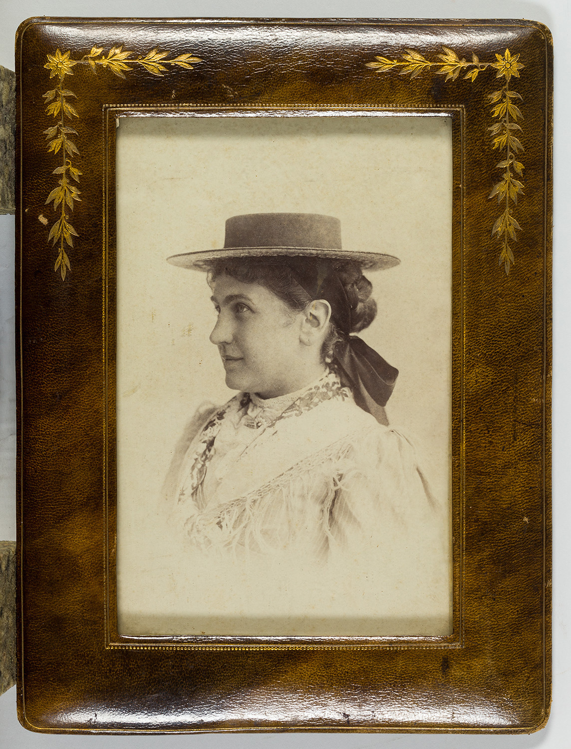 Katharina Schratt - Rollenfotografie im Theaterstück "Meineidbauer" im Burgtheater, im goldgeprägten Lederrahmen.