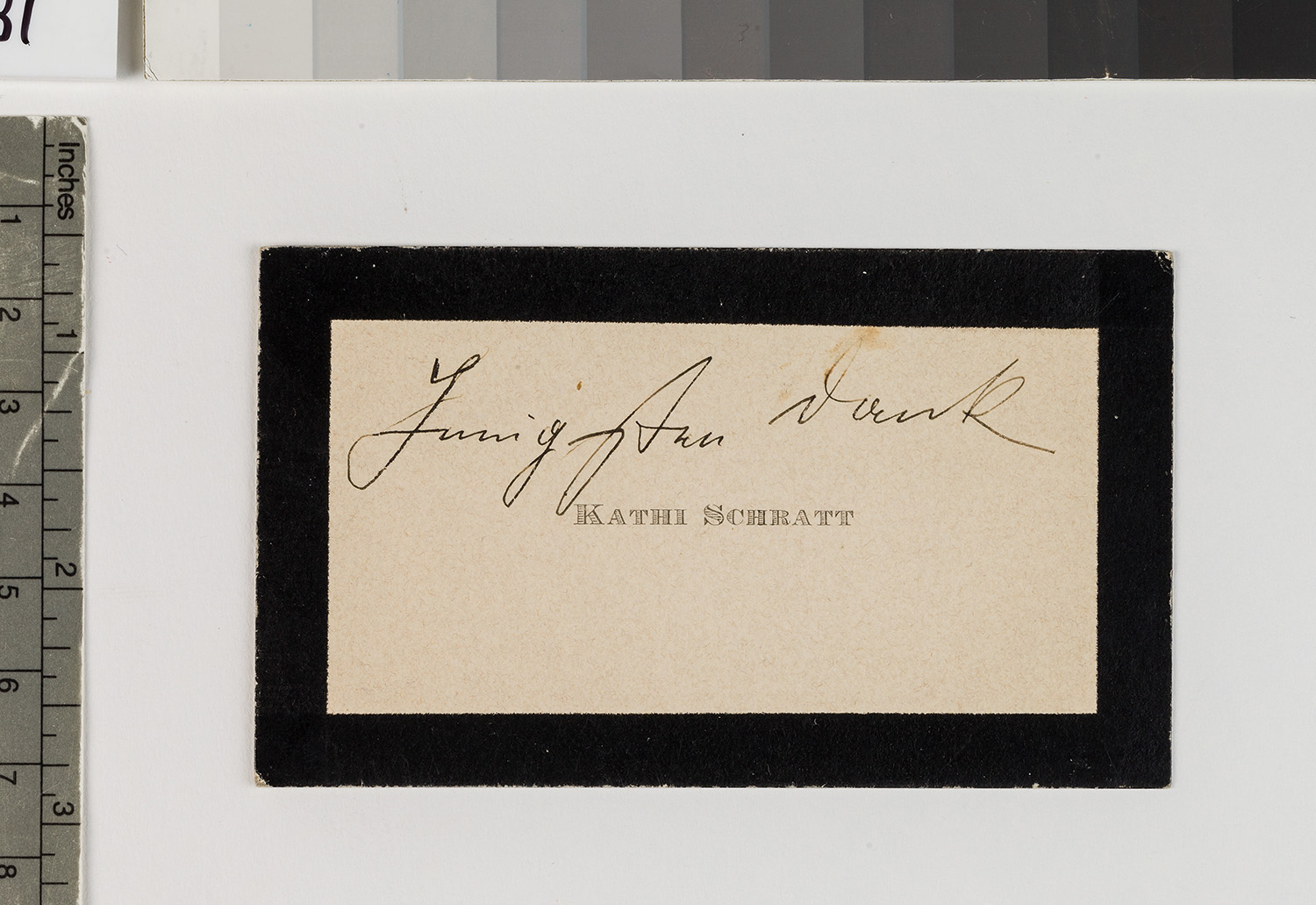 Katharina Schratt - Visitenkarte mit Trauerrand und handschriftlicher Vermerkt "Innigster Dank"