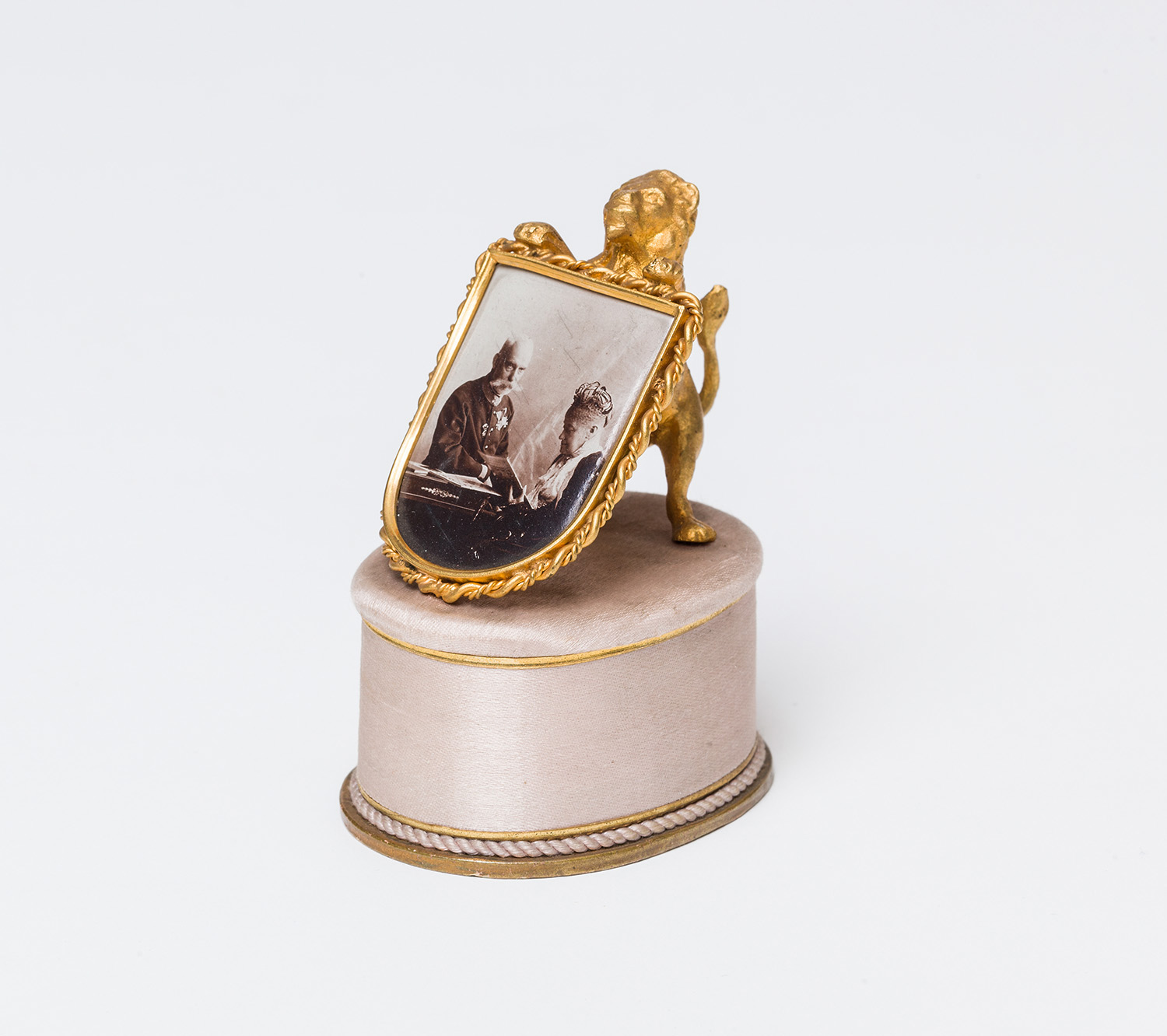 Kaiserlicher Hof - Hoftafelbonbonniere. Dose mit plastischem steigendem Löwen, der ein Wappen mit photographischem Portrait Erzherzog Rainers und seiner Gemahlin hält