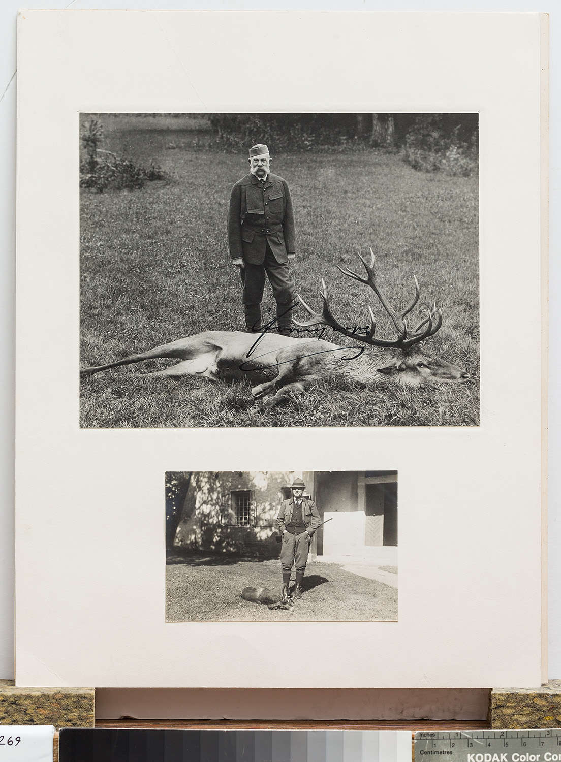 Signierte Fotografie des Kaisers Franz Joseph I. mit erlegtem kapitalen Hirschen