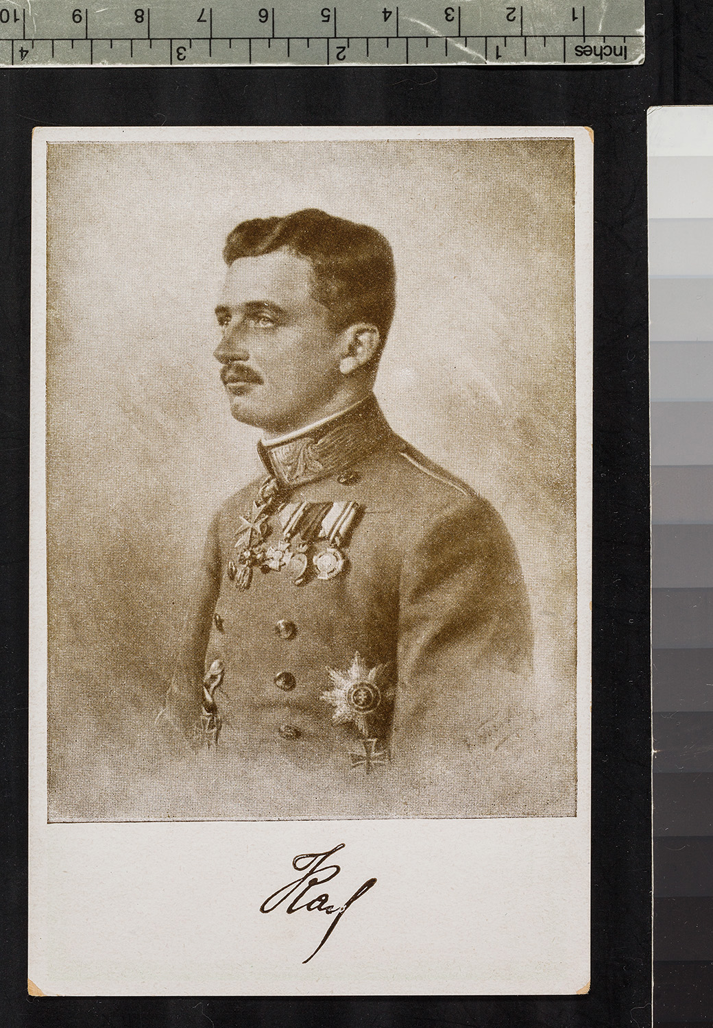 Kaiser Karl - Correspondenzkarte mit Fotografie im Profil, mit faksimilierter Unterschrift