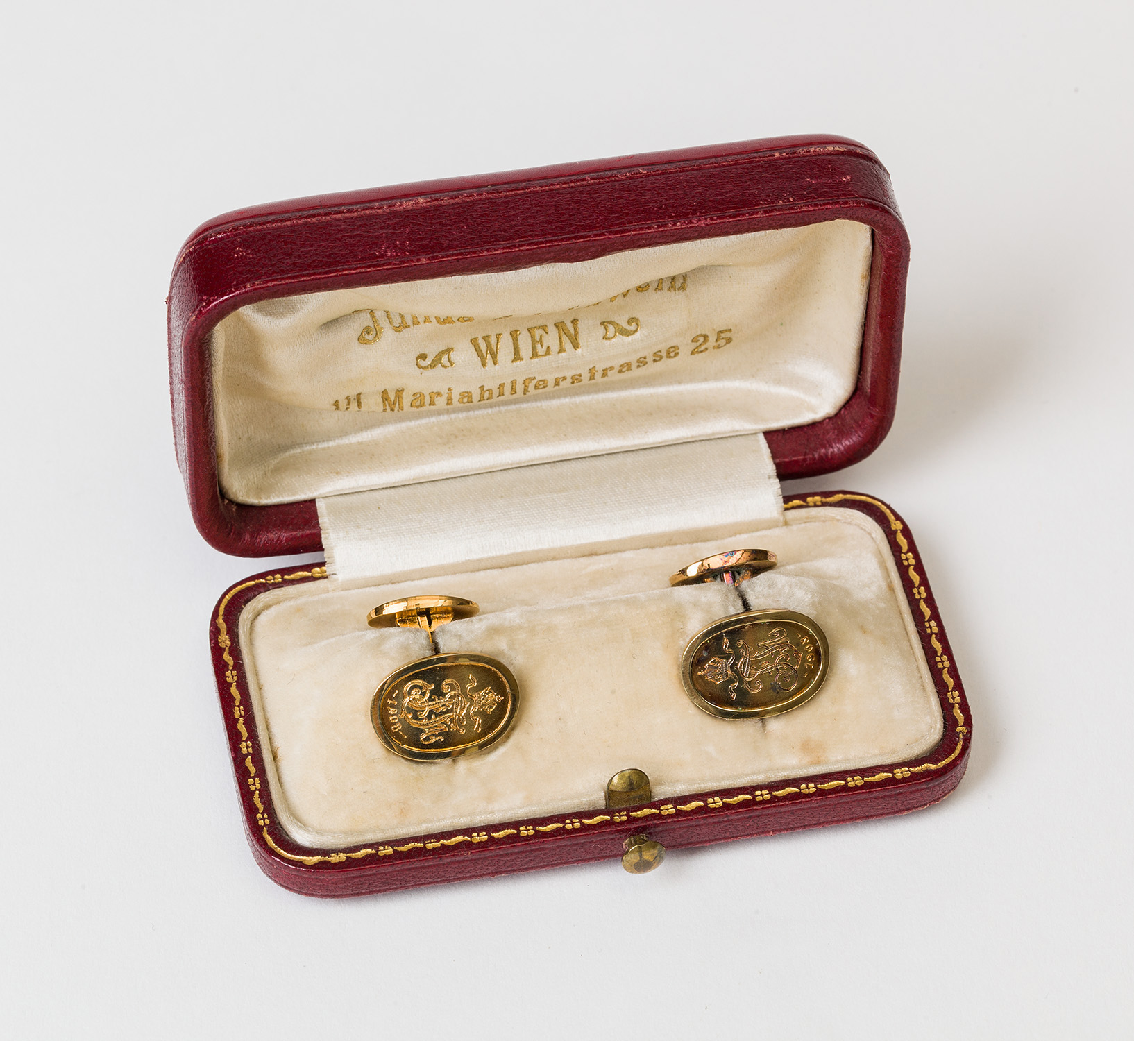 Paar Geschenkmanschettenknöpfe mit Monogramm FJI unter Kaiserkrone und Jahreszahl 1908. Rotes Lederetui mit Goldprägung zugehörig.