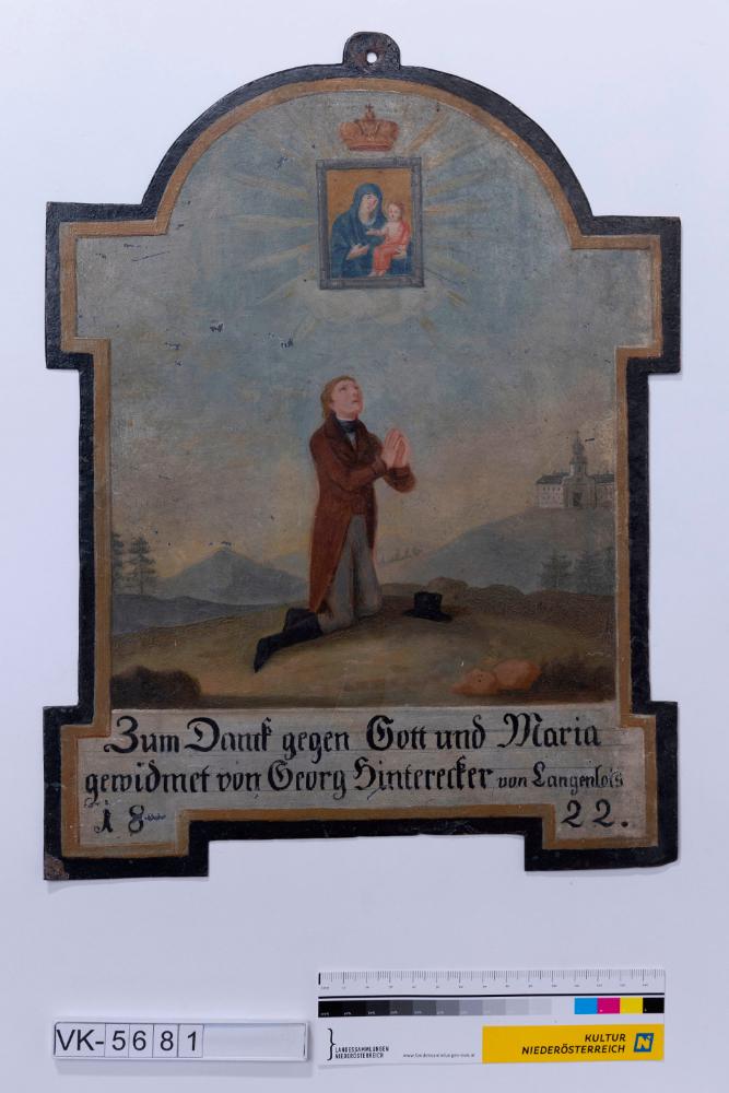 Votivbild auf Metallplatte mit Darstellung eines betenden Mannes in einer Hügellandschaft, im Hintergrund Kirche, im Himmel Maria mit Kind. Aufschrift: "Zum Dank gegen Gott und Maria gewidmet von Georg Hinterecker von Langenlois 1822". Auf der Rückseite Fragmente eines Textes auf Papier.