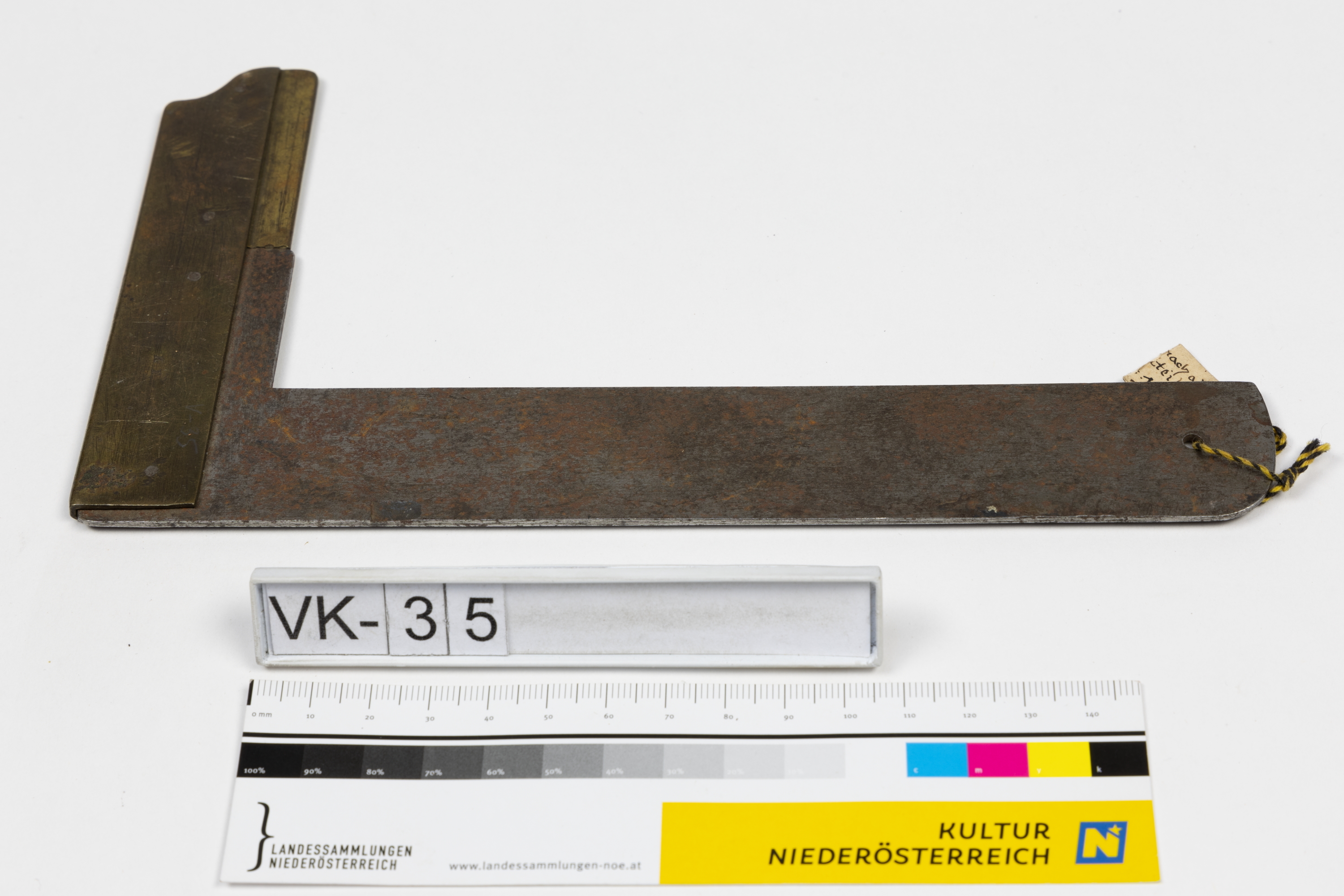 Winkeleisen mit einer aufgenieteten Messingleiste, in die eine Beschriftung eingeschlagen ist: "IGNATZ KOBER A... 1809".