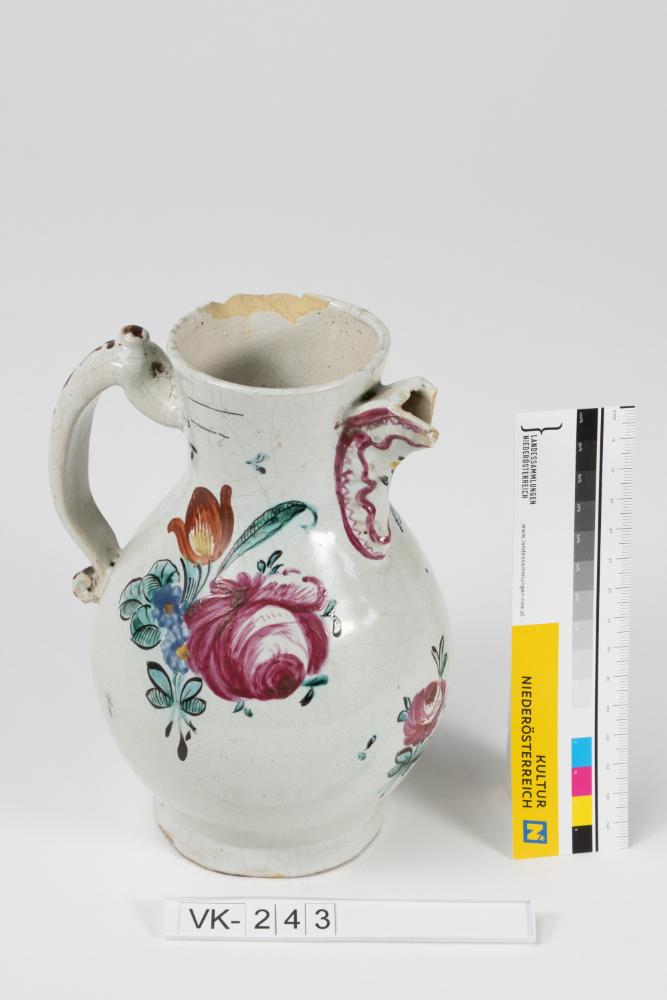 Bauchiger Krug mit unterrandständigem Henkel und Ausguss mit mehrfärbiger Darstellung unterschiedlicher Blüten nebst Blattwerk.
