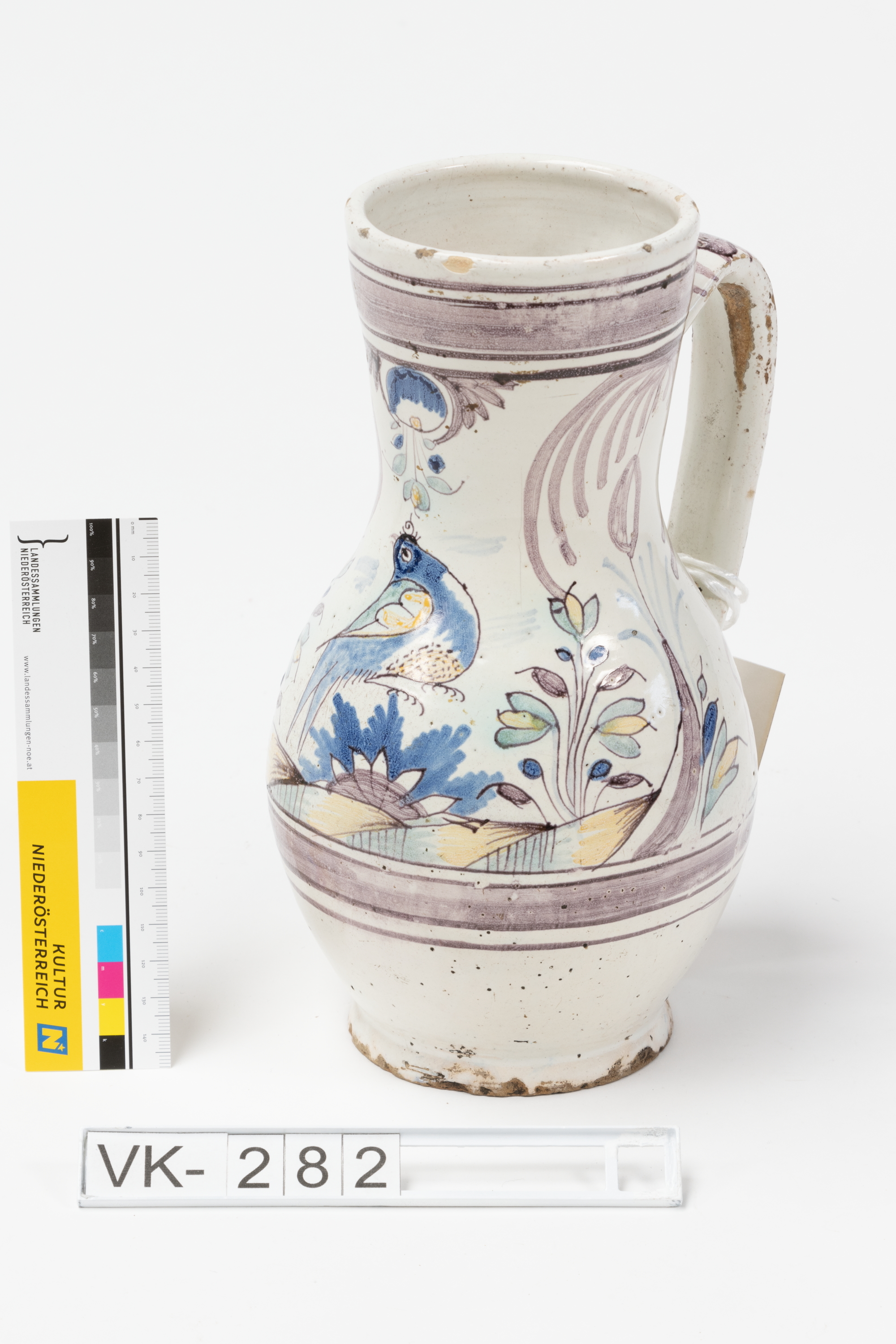Bauchiger Majolika-Krug mit unterrandständigem Henkel und mehrfärbiger Bemalung: Florale Elemente, umlaufende Linien und ein Vogel.