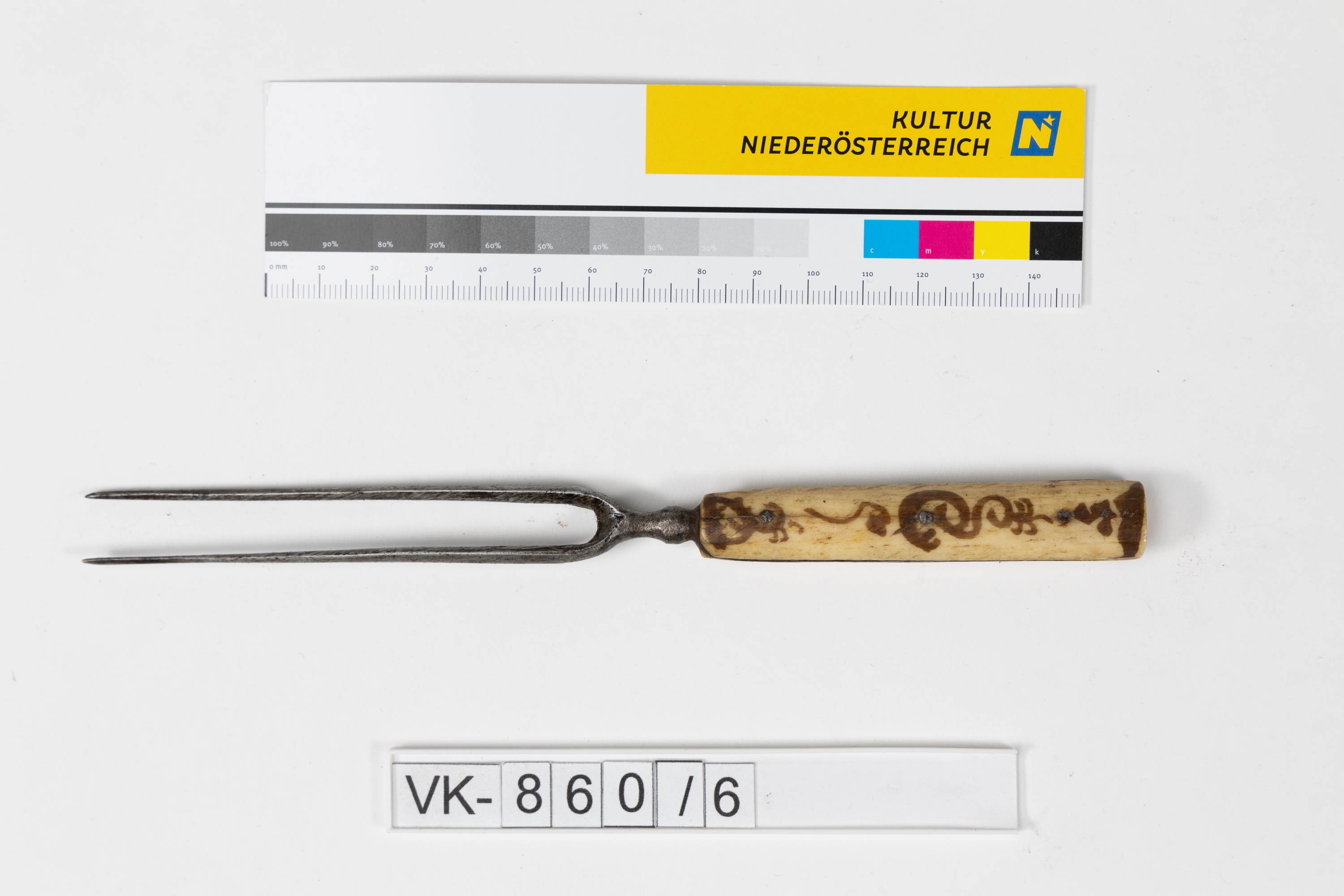 Zweizinkige Gabel mit zum Ende hin verbreiterten Griff mit ovalem Querschnitt und verzierten Hornschalen.